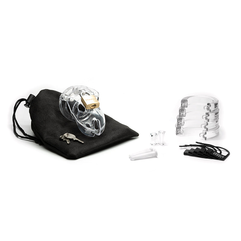 Q: What comes included with the Mr. Stubb Chastity device?A: The kit includes the Mr. Stubb cage, U-ring sizes #1-5, locking pins and spacers, a brass lock with two keys, five numbered plastic locks for discreet TSA passage, a black drawstring storage bag, and a premium lube sample packet.