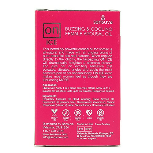 Q: What is Sensuva On Ice Buzzing and Cooling Female Arousal Oil?A: Sensuva On Ice is a buzzing and cooling arousal oil designed for women, helping to enhance physical stimulation and body awareness.