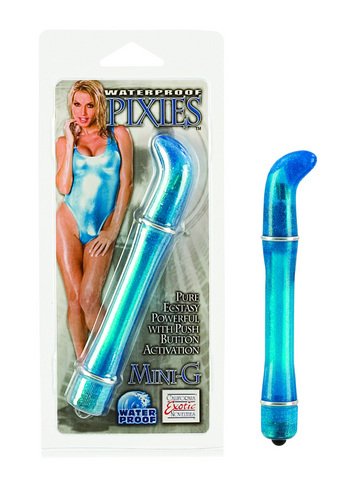 Waterproof Pixies Mini G Blue Vibrator. Power packed petite waterproof vibrating massager with curve to zone in on the G-spot pleasure zone. Made with durable and easy to clean plastic, this massager has a sparkling shimmer while the contoured shape suppl