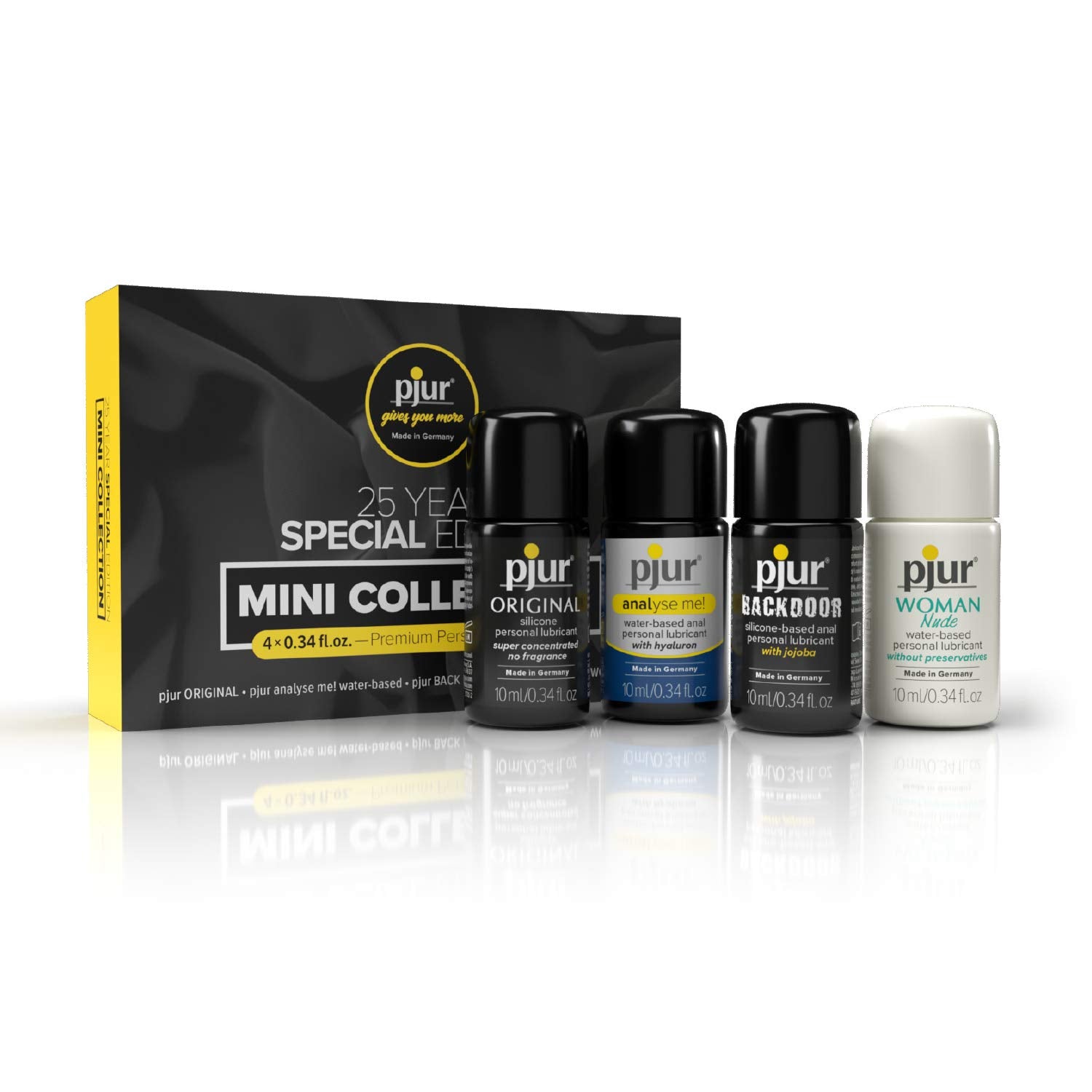 A: The collection includes four 10ml bottles: pjur ORIGINAL, pjur WOMAN Nude Silicone, pjur BACK DOOR Silicone, and pjur Analyse Me Water-Based.