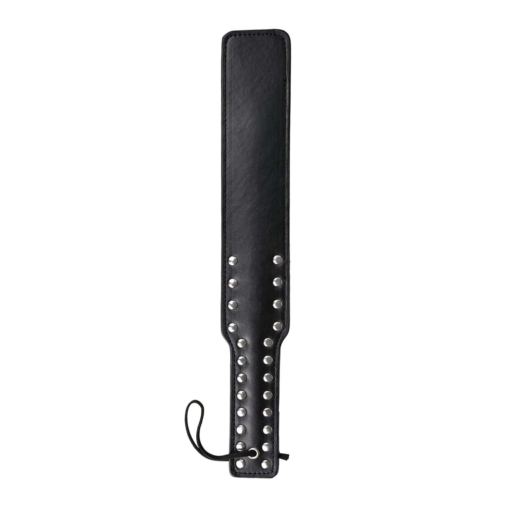 Q: How does the studded design enhance the experience?A: The metal studs frame both sides of the spanking surface, providing additional sensation and contrast against the skin.