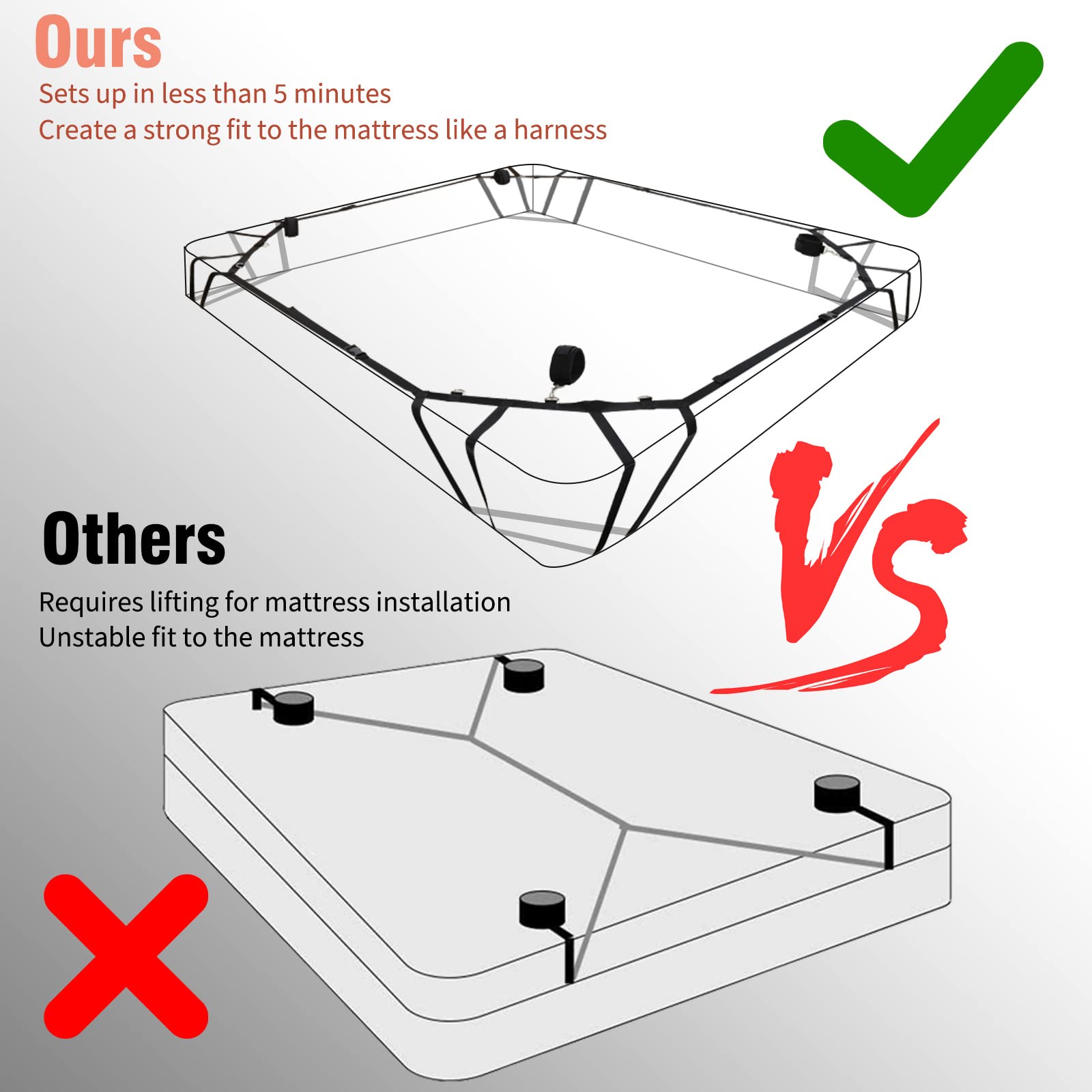 4-Corner Bed Restraint System Based on the all the bed restraints on the market, we have developed the bondage restraints that are extremely easy to install. This Bed Restraint is unique because it installs onto your mattress by fitting the straps onto each corner of the mattress and connecting the corners together with the fully adjustable rops. Top and Bottom strap connectors on each side create a strong fit to the mattress like a harness. Any little woman can easily install it to surprise husband/partner on Valentine 's Day, anniversary, or special days. If you are a seasoned practitioner, then get creative and upgrade your gear. About Our Brand More than a sex toy store. We are also provide so many kinky/fetish toys you can look into as well.