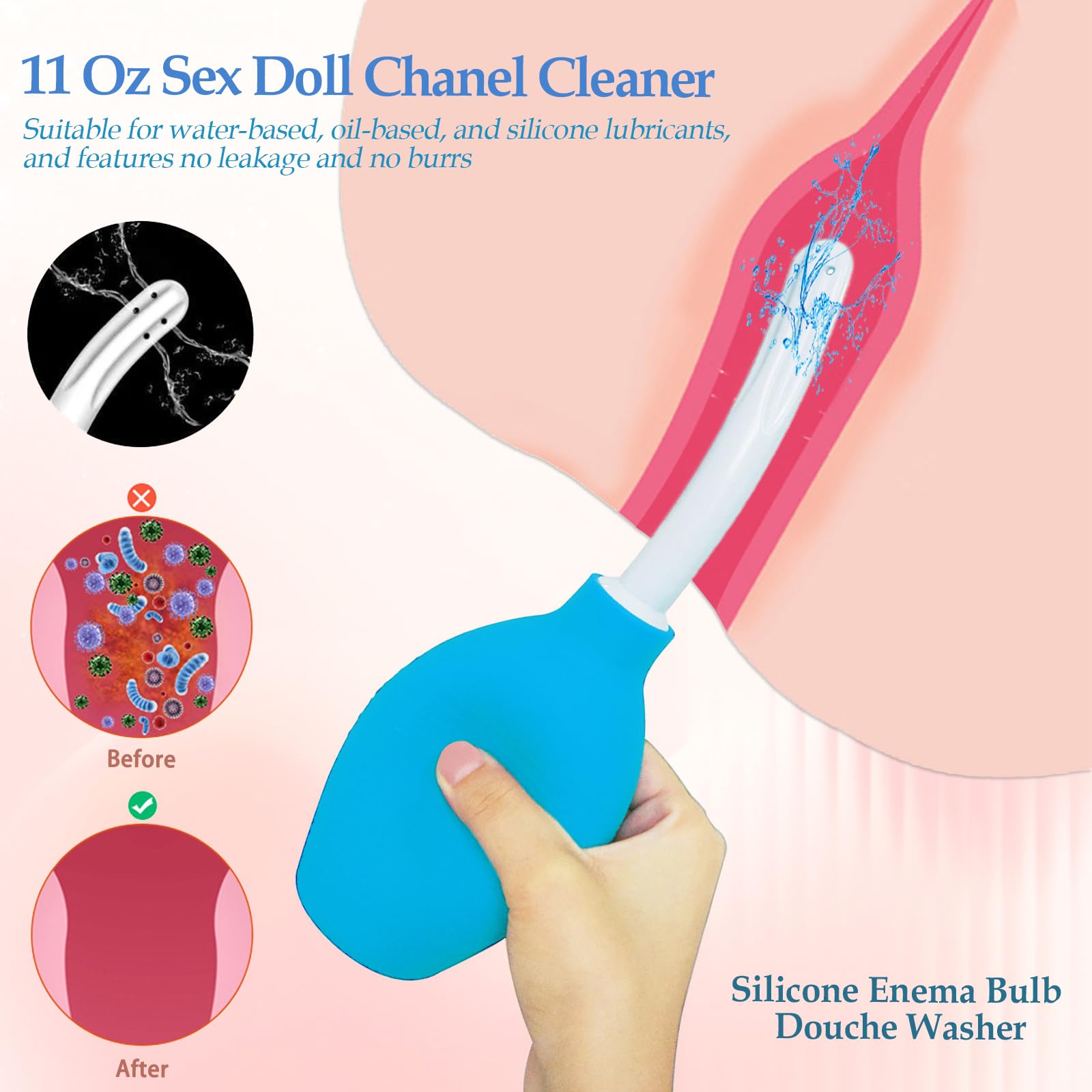 Q: How does the douche washer work for cleaning?A: The douche washer features a smooth, elastic silicone design that allows you to fill it with clean water. By gently squeezing the bulb, water is sprayed out of four powerful spray holes, making it easy to clean the doll's channel.