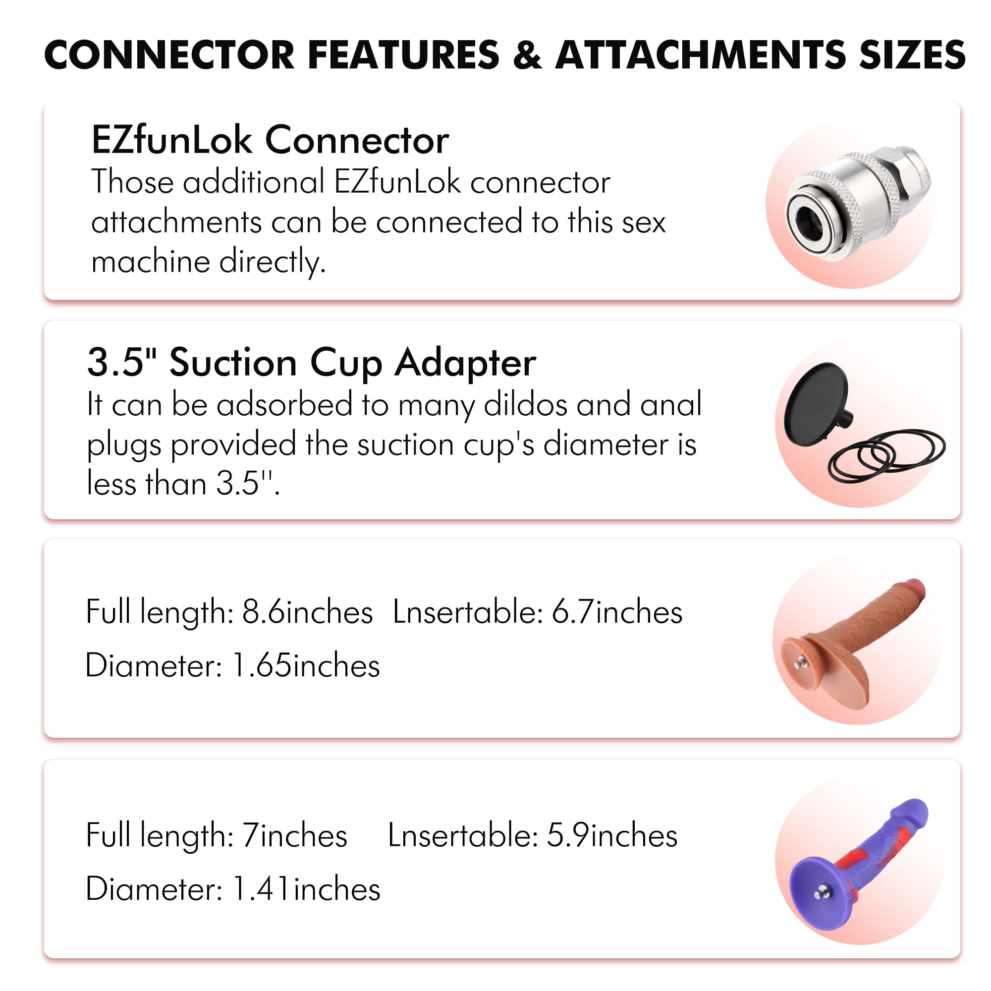 Q: What items are included in the package?A: The package includes 1 Sex Machine, 1 Standard Dildo, 1 Suction Cup Adapter, 1 Blue Silicone Dildo, 1 Wireless Remote, and 1 User Manual.