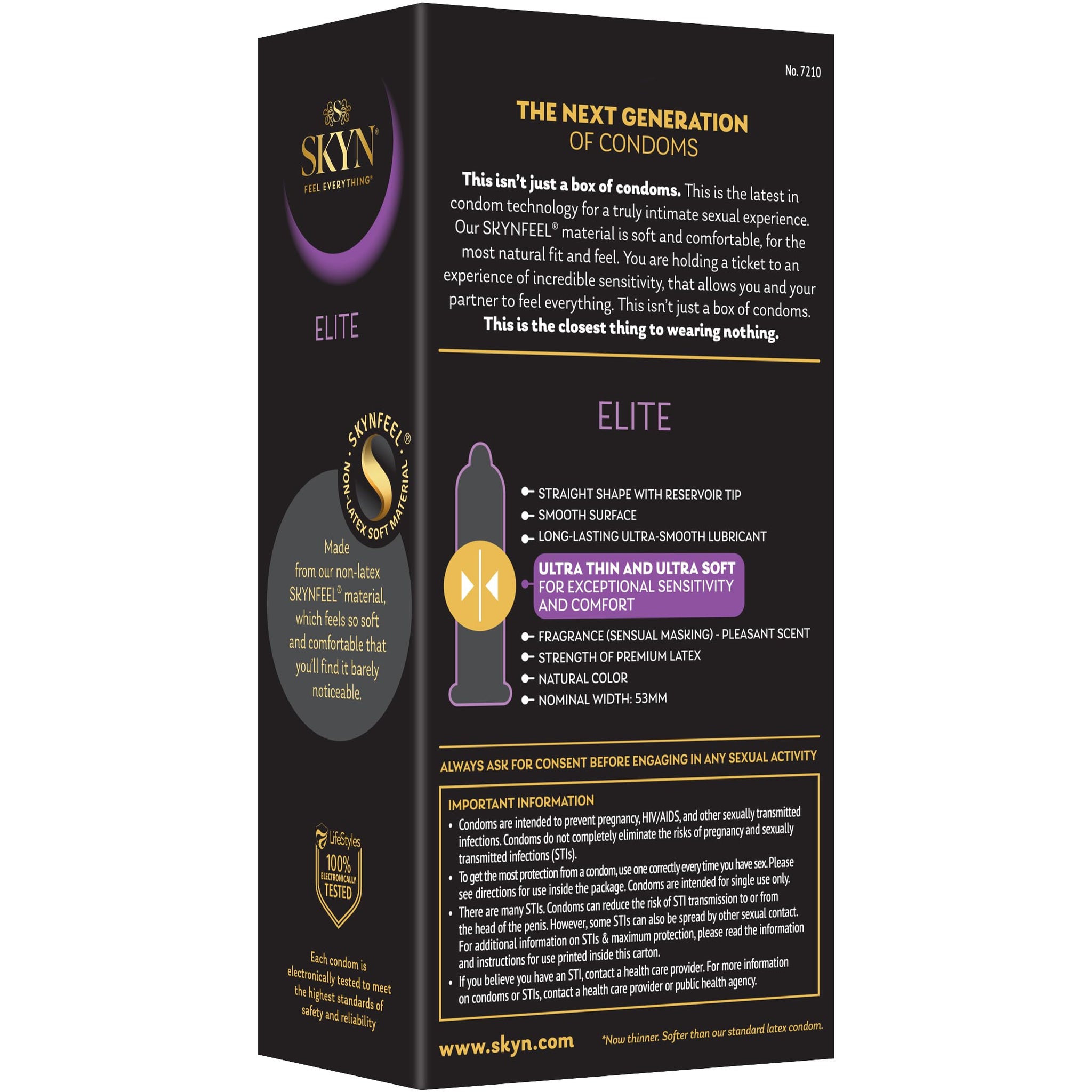Q: How do SKYN Elite condoms compare to regular latex condoms?A: SKYN Elite condoms are 15% thinner than standard non-latex condoms, providing a more sensitive and natural feeling during use.