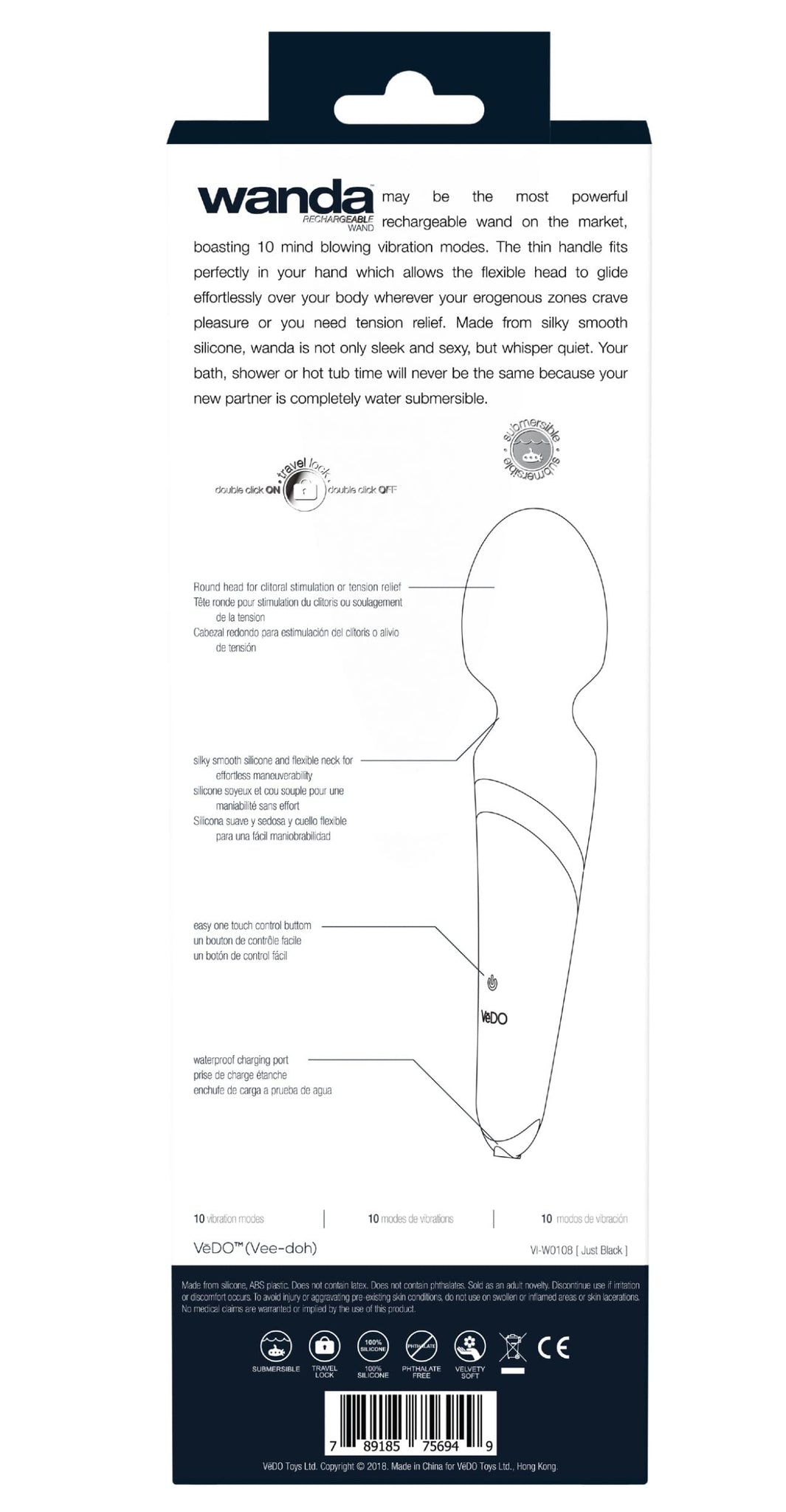 Vedo Wanda Rechargeable Massage Wand Vibe Just Black. Powerful, flexible head delights you as always. Wanda rechargeable wand may be the most powerful rechargeable wand on the market, boasting 10 mind blowing vibration modes. The thin handle fits perfectl