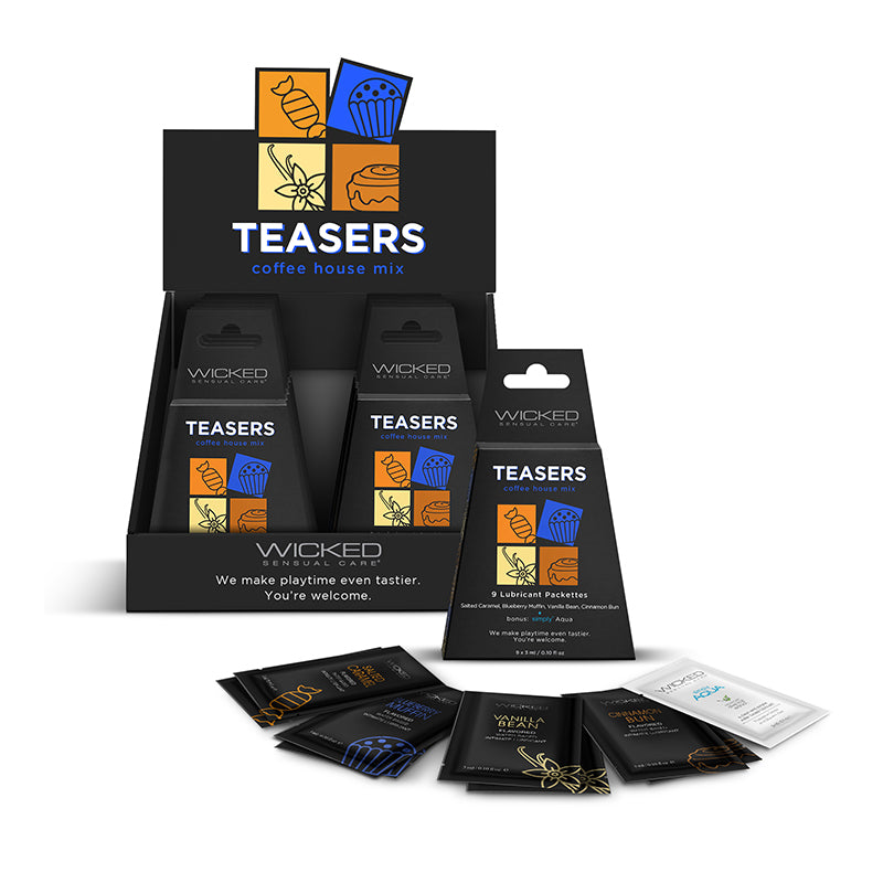 Decadent Delights Await Your Taste Buds With Our Teasers Coffee House Mix! BrBrEach Travel-Size Packet Is Bursting With Flavor To Make Your Mouth Water And Satisfy Your Cravings During All Types Of Play. BrBrPro Tip: Grab A Teasers Fresh Fruit Mix And Create Your Own Flavor Combo! BrBrUlLiNever StickyLiLiNo AftertasteLiLiVeganLiLiParaben Free LiUlBrDirections: Apply To Area(S) Where Lubrication Is Desired. Cleans Away Easily With Water. BrBrSalted Caramel Blueberry Vanilla Cinnamon Ingredients:: Water Glycerin Cellulose Gum Stevia Rebaudiana Extract Olea Europaea (Olive) Leaf Extract Hydroxyethylcellulose Tetrasodium Edta Citric Acid Sodium Benzoate Potassium Sorbate Flavor. BrBrSimply Aqua Ingredients: Water Propanediol (Corn) Cellulose Gum (Cottonseed) Hydroxyethylcellulose (Tree Bark) Disodium Edta Olea Europaea (Olive) Leaf Extract Stevia Rebaudiana (Stevia) LeafStem Extract Citric Acid Sodium Benzoate Potassium Sorbate