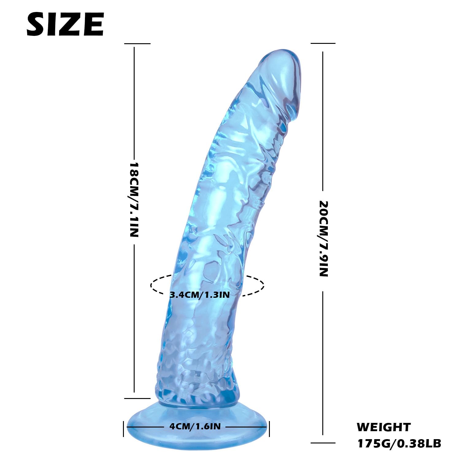 Q: What is the size of the Glow in The Dark Green Dildo?A: The Glow in The Dark Green Dildo measures 7.9 inches in total length, with a comfortable insertion depth of 7.1 inches.