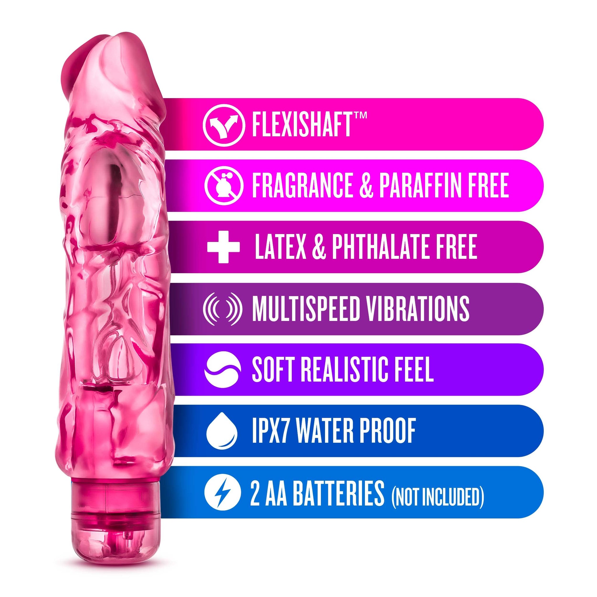 Q: What makes the design of the Blush Wild Ride vibrator realistic?A: The Blush Wild Ride vibrator features a soft and realistic feel, complete with textured veins designed for intense stimulation, mimicking the look and feel of a real penis.