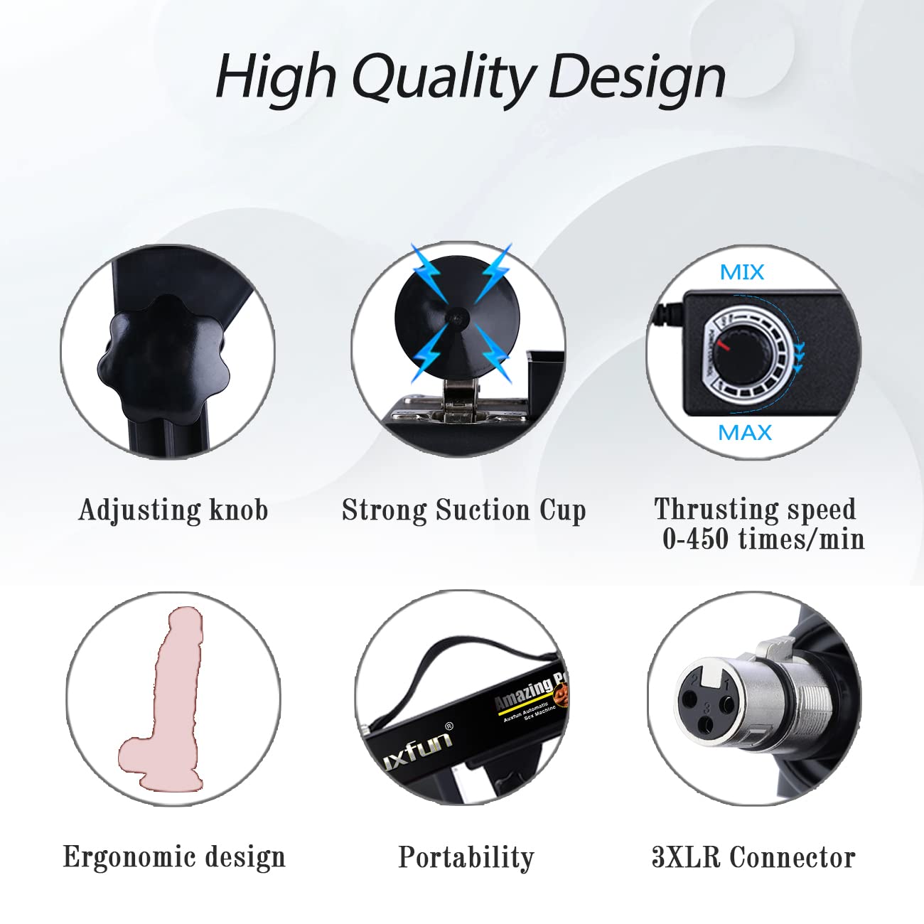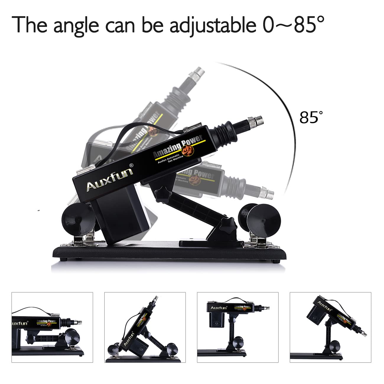 AUXFUN is famous for transforming the look, feel and function of how sex toys are perceived, bringing a new level of luxury to products of this kind. If you have any problem, please let us know. Product Parameter Input: 110V~240V 50~60HZ Output: DC 12~24V 1~2A Power: 0~24W Speed: 0-450 Times/Minute Extension Distance: 6cm Adjusting Angle: About 85 degrees Warm Tips 1. Condoms and Lubes are better and safer if used. 2. The suction cup needs to be placed on a smooth floor to have a good adsorption capacity. Besides, adding a little water at the bottom of the suction cup will have a stronger adsorption capacity. 3. Do not cook attachments in high temperatures or boiling water. 4. It is recommended to press the chassis with some heavy objects when in maximum speed. 5. Can 't sit on the machine to avoid damage to the machine. 6. To avoid shortening the life of the motor or damaging the motor, avoid using it for more than 60 minutes when each time you play. PRECAUTIONS 1: Keep the circuit part away from the water, avoiding circuit faults. 2: Avoid to hold back the telescopic shaft thrusting for a long time, for fear of shortening the life of the motor or damaging it. 3: It is normal the machine goes hot after long-term use, we suggest not use the machine continuously over 60min.
