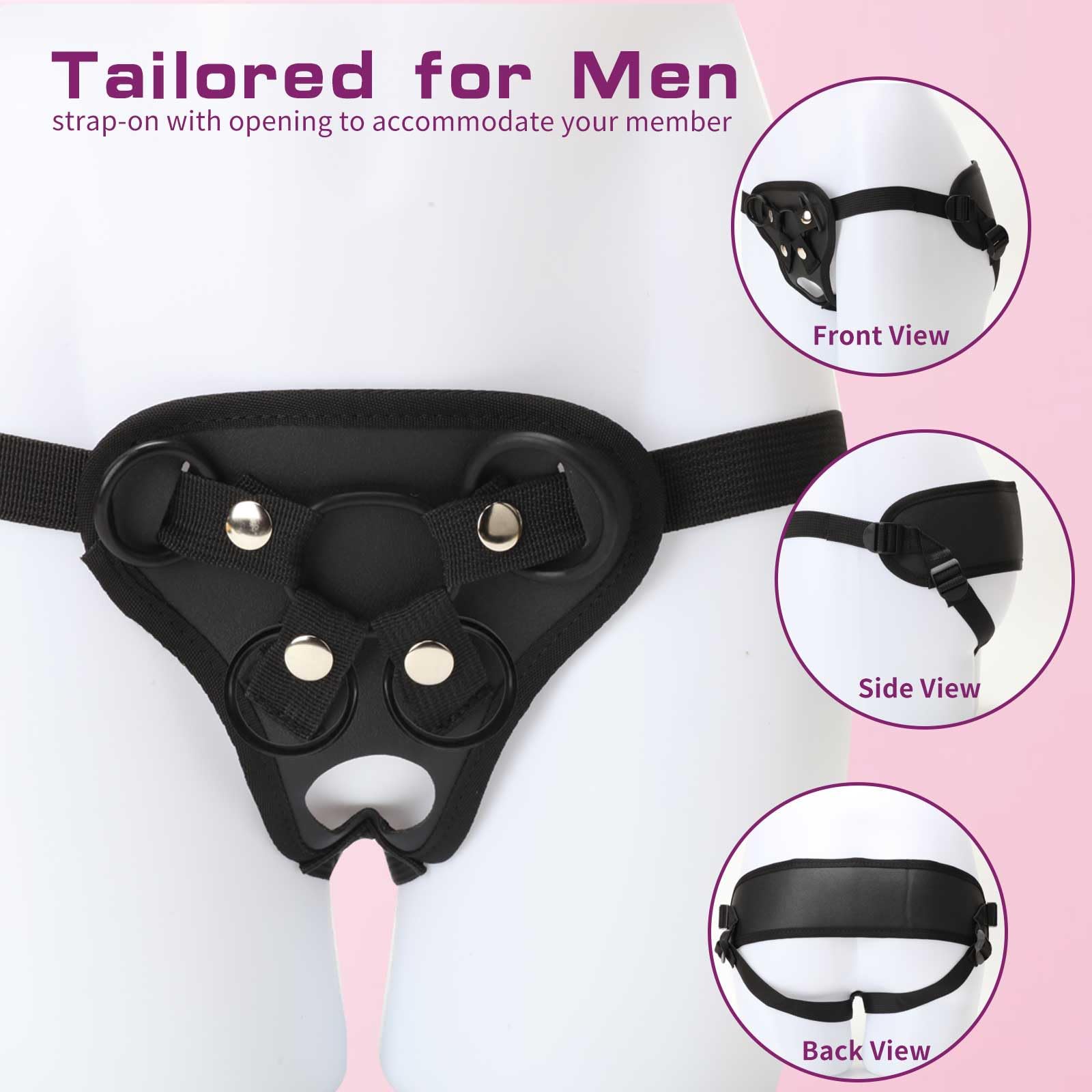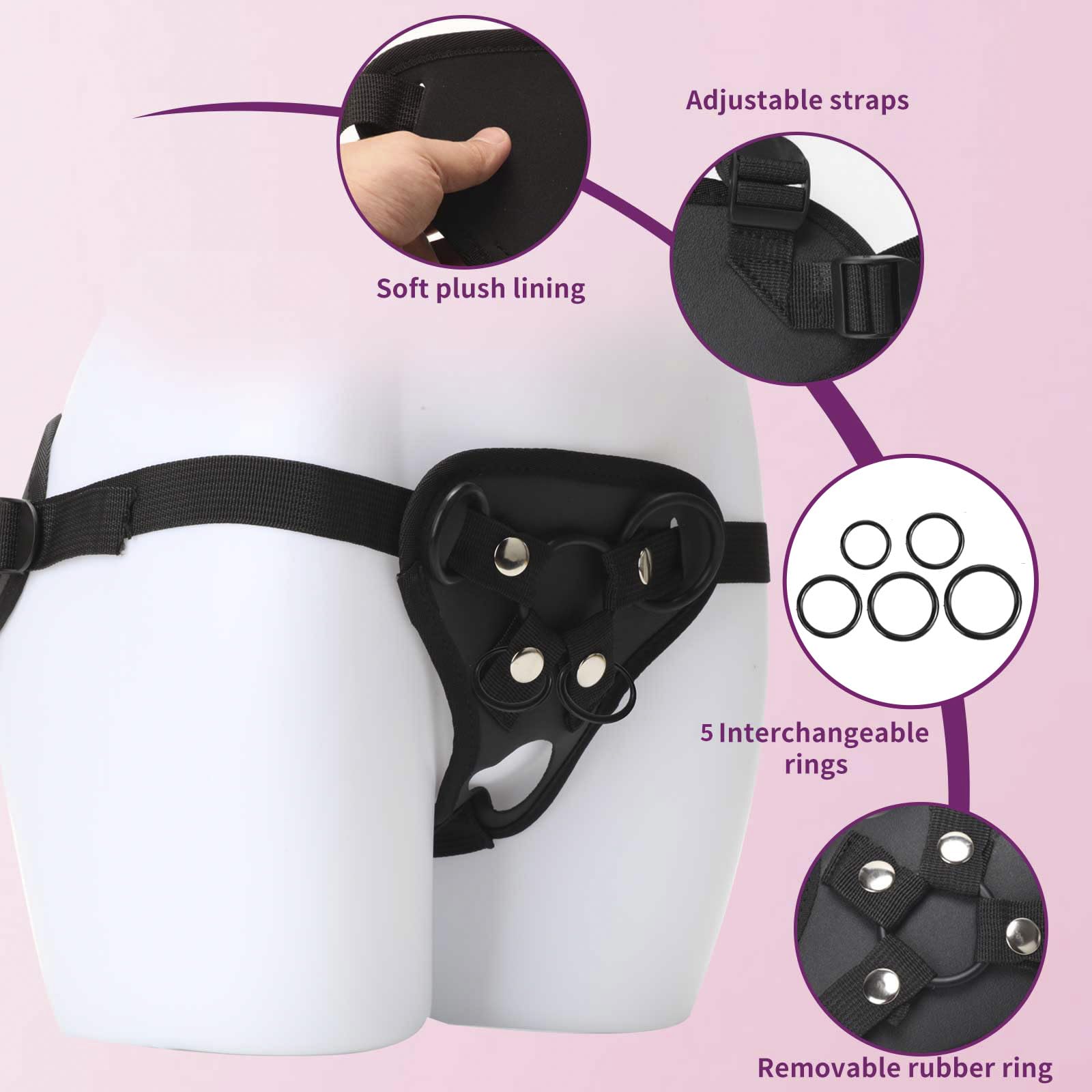 Package: 1 x Strap-On Harness 3 x Rubber O-RingsFeature: Wider straps to evenly distribute pressure while in use. The open backdoor design make you change roles immediately in the game. The harness is adjustable and will fit securely around waists between 25 and 59 inches. 4 types of rubber O-rings, switch at any time according to the size of your toy sucker. Discreet packaging and delivery ensures your privacy.