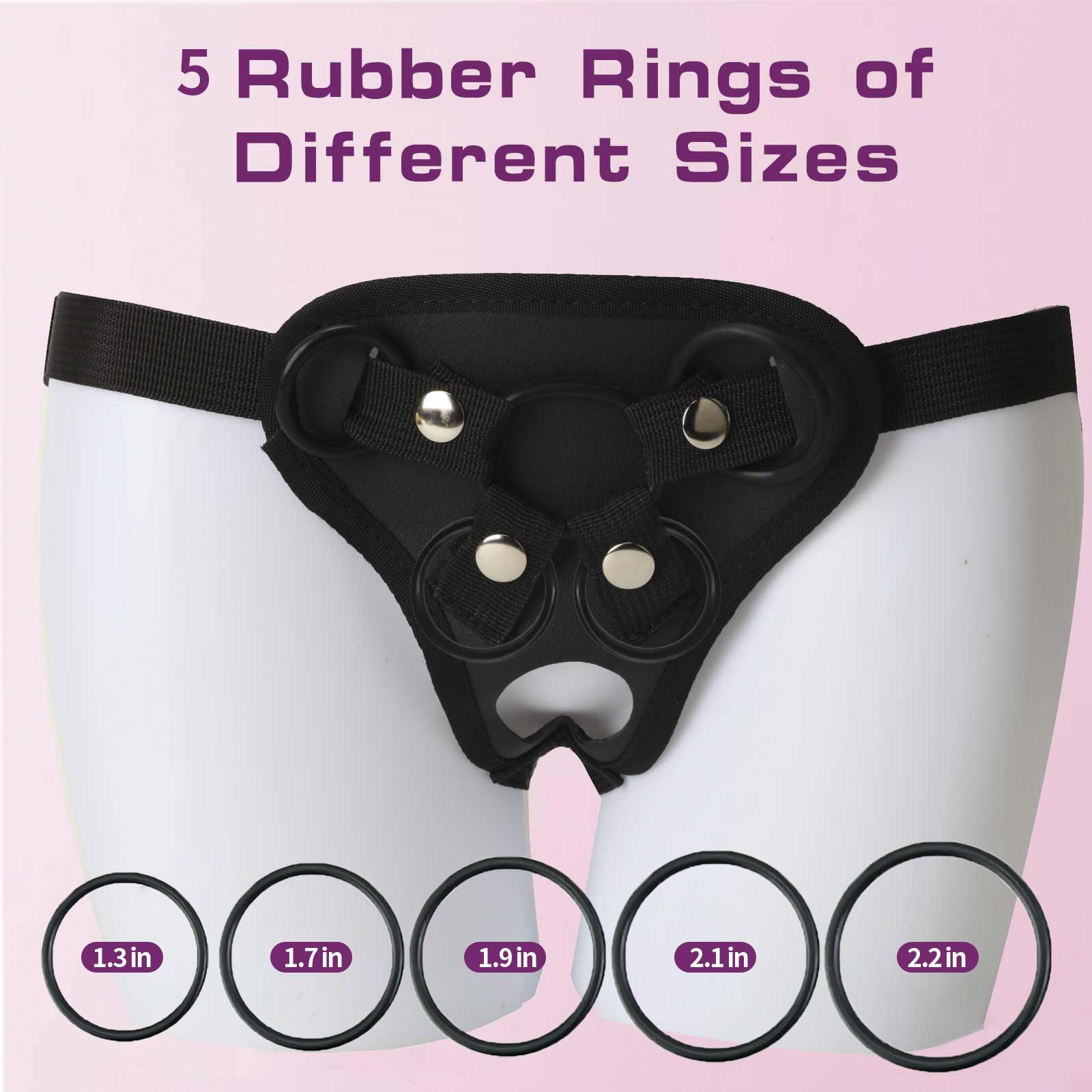 Q: Can this harness be used with different types of dildos?A: Yes, the harness is designed to work with a variety of dildos and comes with five detachable rubber rings in different sizes for compatibility.