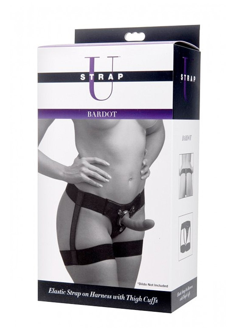 Q: What materials are used in the Strap U Bardot Garter Belt?A: The harness features metal components and wide elastic straps for durability and comfort.