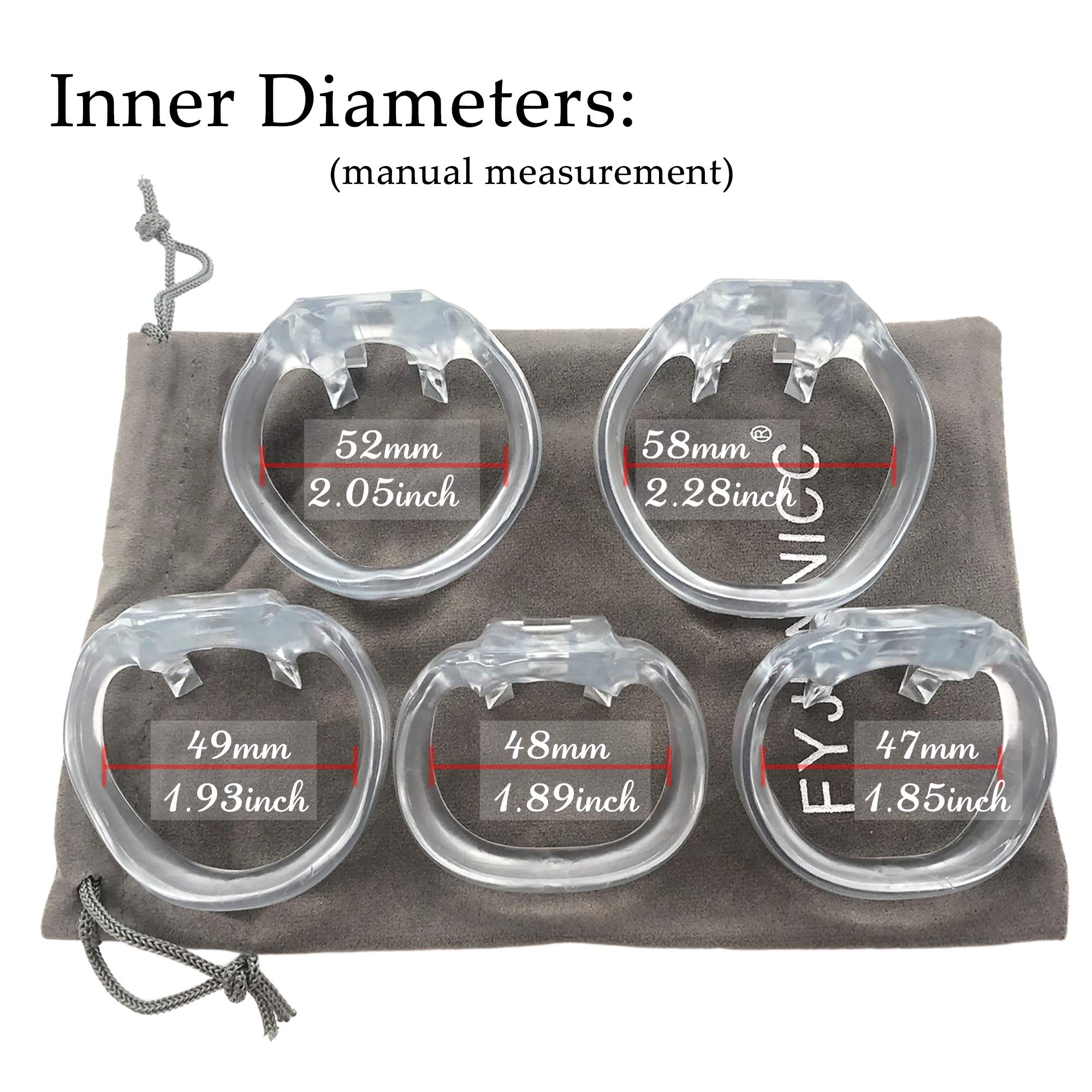 Q: How do I choose the right size ring for the chastity cage?A: The chastity cage comes with five different ring sizes, with diameters of 47mm, 48mm, 49mm, 52mm, and 58mm. Measure your size carefully to select the one that provides a snug fit.