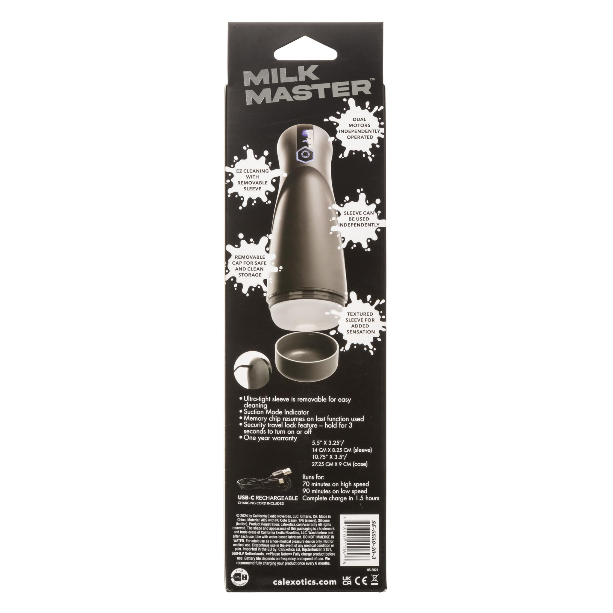 When your/their hand feels a wee bit same-old, may we suggest an upgrade? CalExotic's Milk Master Automatic Stroker, for instance? It's good for your bone(s)!Aside from a discreet case with a storage-friendly cap, the vibrating AND suction-pulsing Milker lets you or your penis-owning partner deep-dive into a soft, sexily textured sleeve. Once inside, you can choose from and combine ten throbbing vibration modes and ten more powerful suction levels. The vibration and suction functions are controlled separately on a user-friendly interface, so you can create your orgasmically ideal stimulation situation.CalExotics' signature lifelike TPE and ABS plastic make the Milk Master extra easy to clean and maintain. Pop out the sleeve, rinse it with mild soap and water, and let it dry before replacing it. The Master is good to go with any water-based lube you love. It's USB rechargeable, and the cord is included. Not for use in water.*The Milk Master's is 10.75''/27.25cm long and 3.5''/9cm in total. It's about 5.5''/14cm penetrable