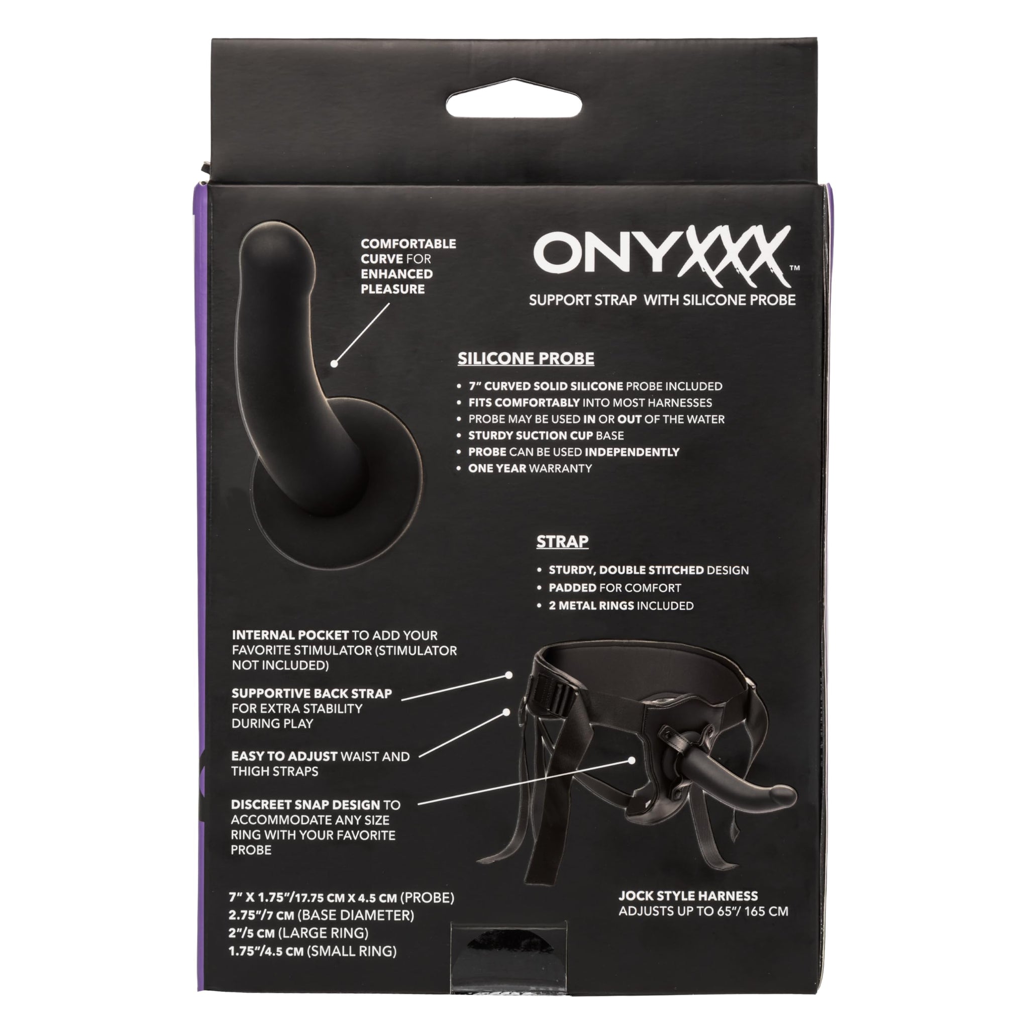Q: What is included in the CalExotics Onyxxx Support Strap set?A: The set includes a jock style harness, a 7 inch silicone probe, and two interchangeable metal rings.