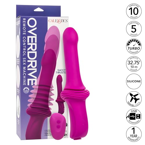 Q: What are the key features of the CalExotics Overdrive Remote Control Sex Machine?A: The CalExotics Overdrive features a powerful sex machine with a smooth shaft, 10 turbo charged speeds of vibration, and 5 speeds of thrusting action. It includes a detachable suction cup mount for hands-free use and can be controlled via remote.