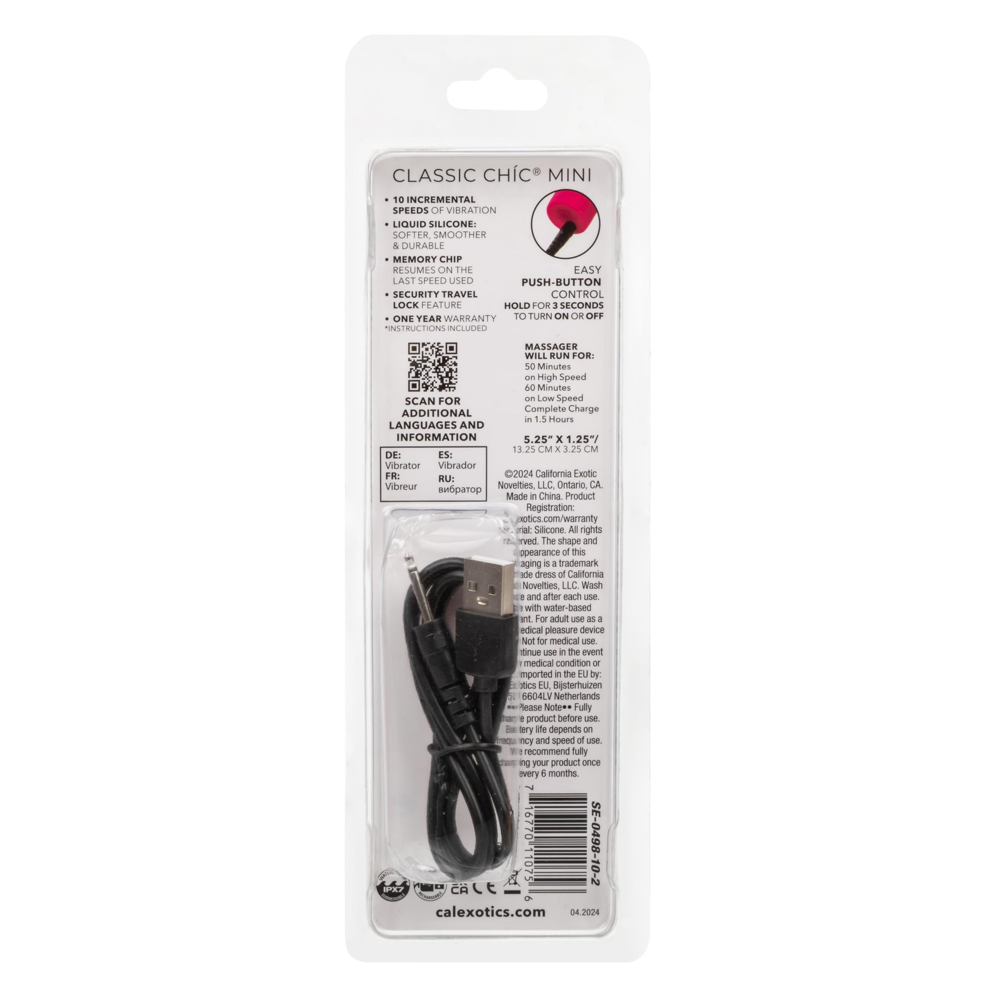 Slip into a world of smooth sensations with the Rechargeable Classic Chic Mini, your sleek companion in the journey of intimate exploration. This liquid silicone mini massager, with its easy push-button operation, is a testament to both luxury and simplicity. It's designed for those who appreciate the finer things in life, providing a soft, smooth, and utterly satisfying touch.Dive deep into the realms of pleasure with 10 incremental speeds of vibration that offer everything from a gentle purr to a deep rumble. Whether you're in the mood for a slow tease or an intense session, this vibrator adjusts to every desire, ensuring each encounter is memorable.Crafted from premium liquid silicone, the Classic Chic Mini is not only softer and smoother but also exceptionally durable and waterproof with an IPX7 rating. It invites you to enjoy your time in the bath or shower, pushing the boundaries of where and how you experience pleasure.Charging is quick and efficient, requiring only 1.5 hours for a full charge. This vibe offers 50 minutes of high-speed intensity or a more prolonged 60 minutes at a gentler pace. Equipped with a state-of-the-art memory chip that remembers your last speed and a security travel lock feature, the Rechargeable Classic Chic Mini ensures your private moments stay private, just the way you like it.