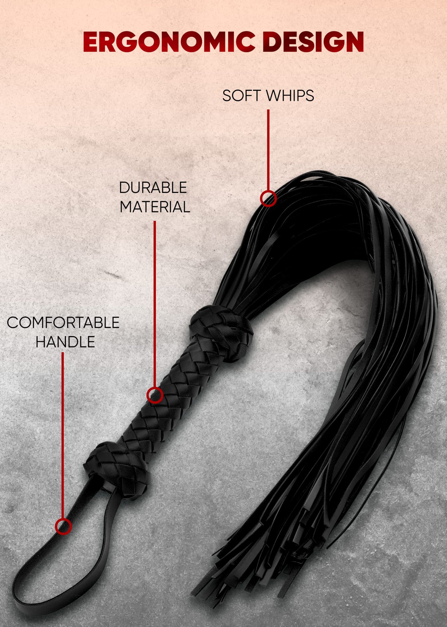 Q: What material is the flogger made of?A: The flogger is crafted from sleek black faux leather, ensuring a sophisticated appearance and comfortable handling.