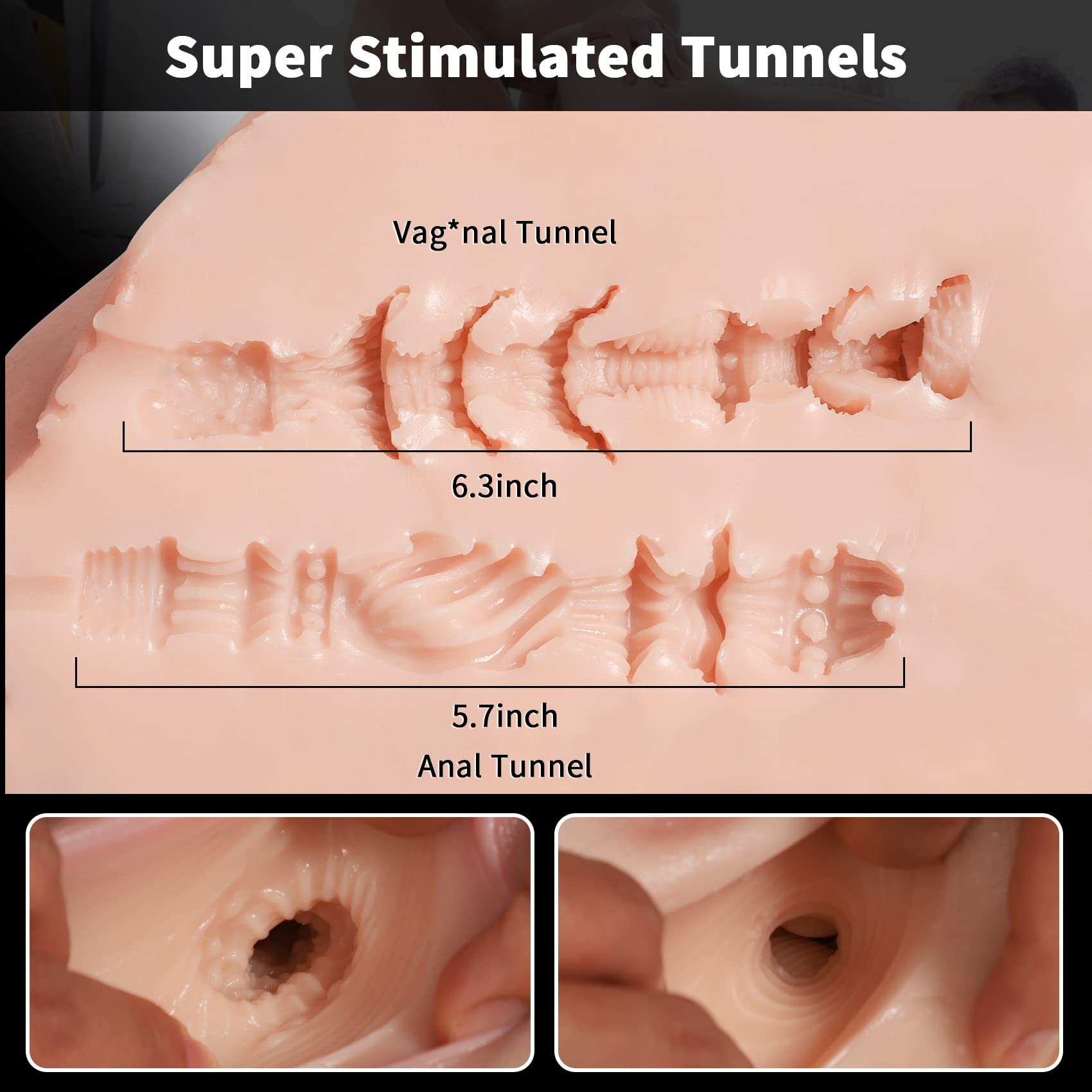 Q: What are the internal features of the sex doll?A: The sex doll features two super real textured tunnels: a 6.3-inch long vaginal tunnel and a 5.7-inch long anal tunnel, providing unique sensations during use.