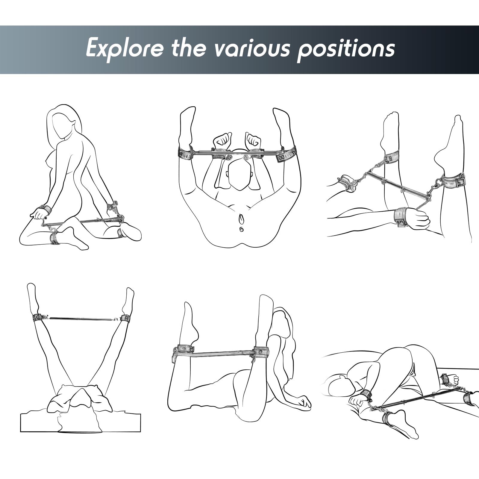 Q: What are the adjustable lengths for the cuffs and the spreader bar?A: The spreader bar adjusts between 22.3 to 34.2 inches, while the handcuffs have an adjustable length of 6.7 to 9.3 inches and the ankle cuffs adjust from 9.4 to 12.2 inches.
