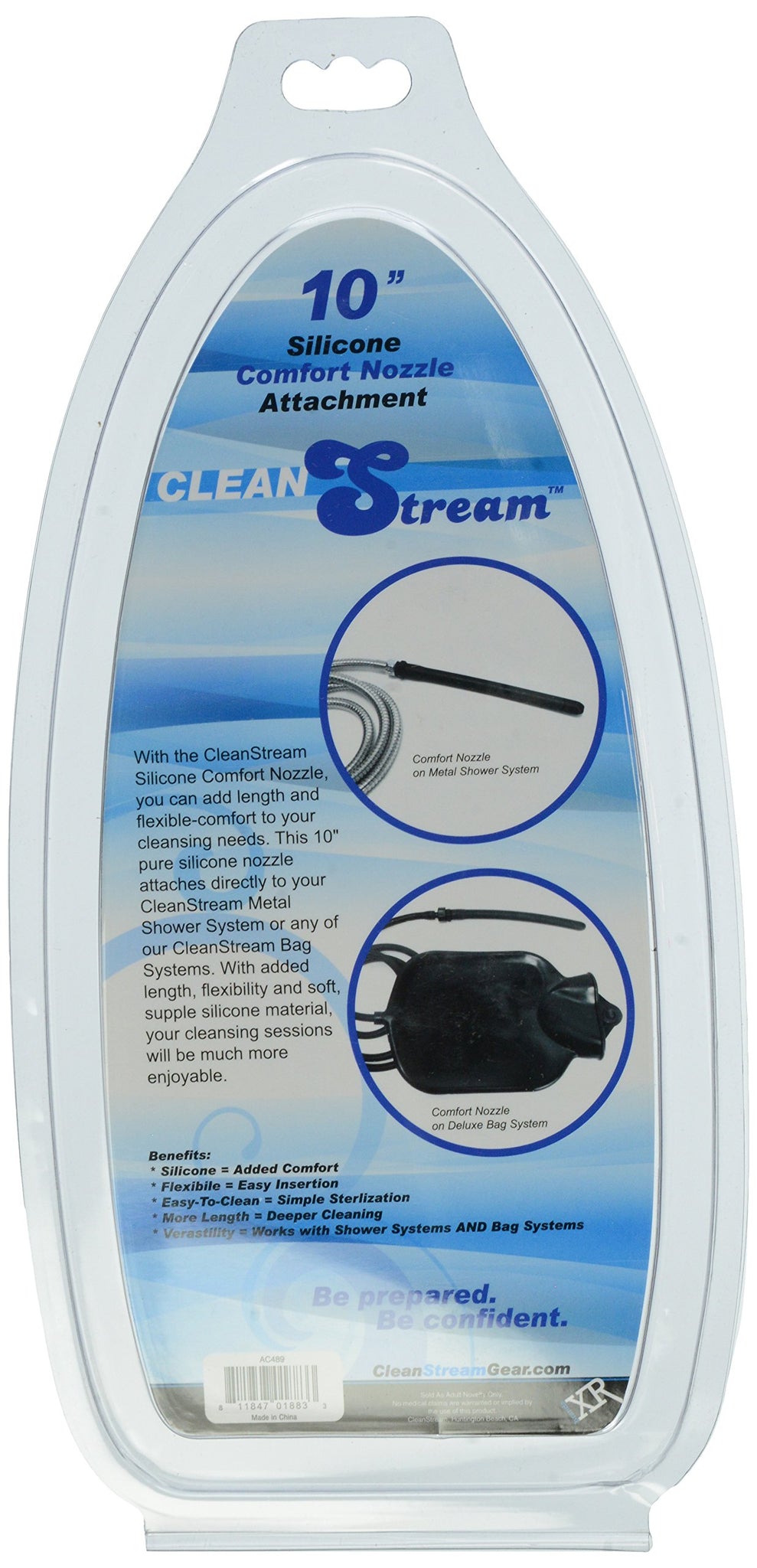 With the CleanStream Silicone Nozzle you can add length and flexible-comfort to your cleansing needs. This 10-inch pure silicone nozzle attaches directly to your CleanStream Metal Shower System or any CleanStream Bag Systems. With added length flexibility and soft supple silicone material your cleansing sessions will be much more enjoyable. Clean before and after each use with soap and warm water. Shower and bag systems adapter.