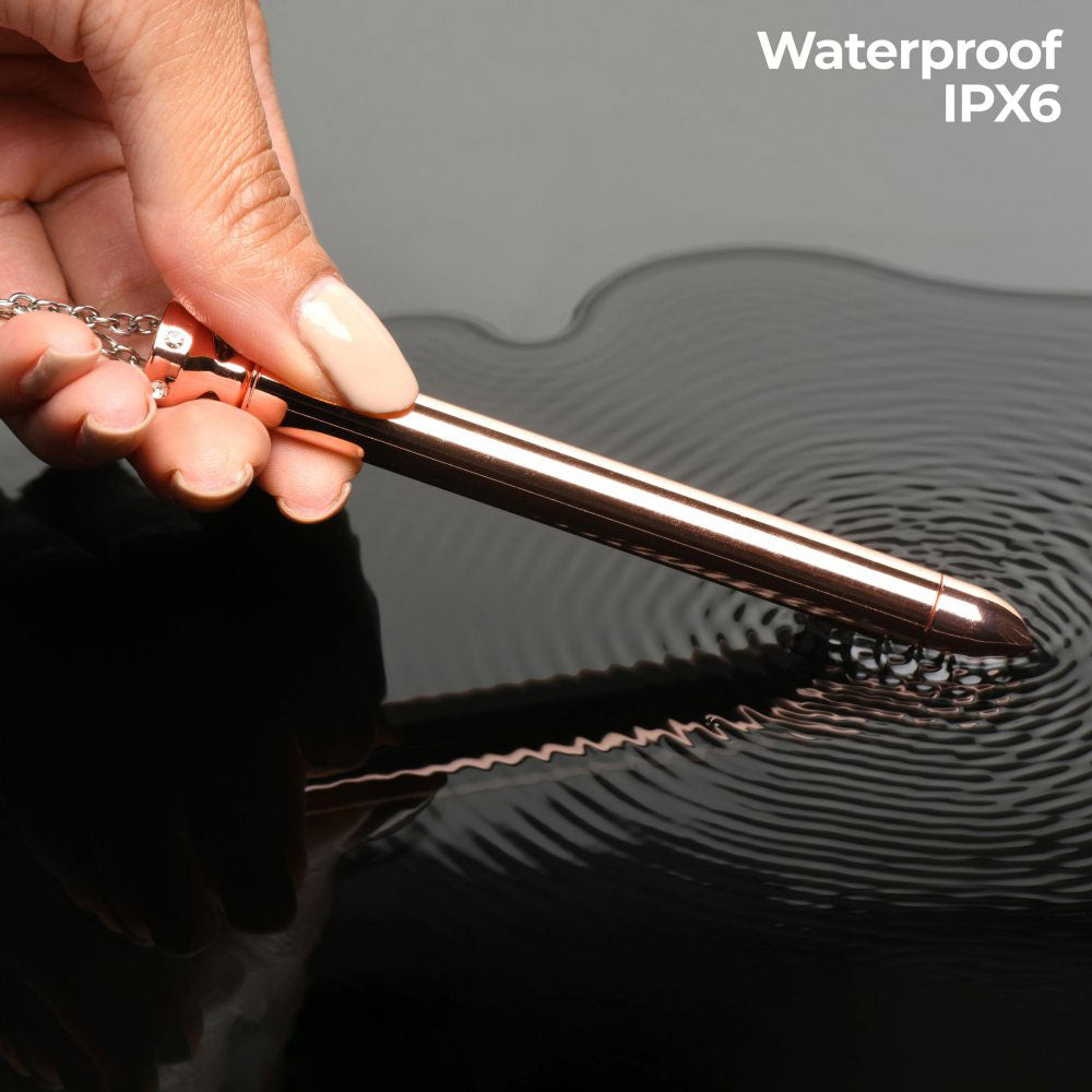 Dare to wear your favorite vibrator right around your neck! The sleek, sexy and stunning metal and rhinestone gem vibrator is made of nickel-free metal for sensitive skin and packs powerful vibrations. Choose from 7 different vibe patterns that you can feel along the shaft and in the pinpointed, smooth, round tip. Recharge using the toy-specific, USB charging cable when not in use.