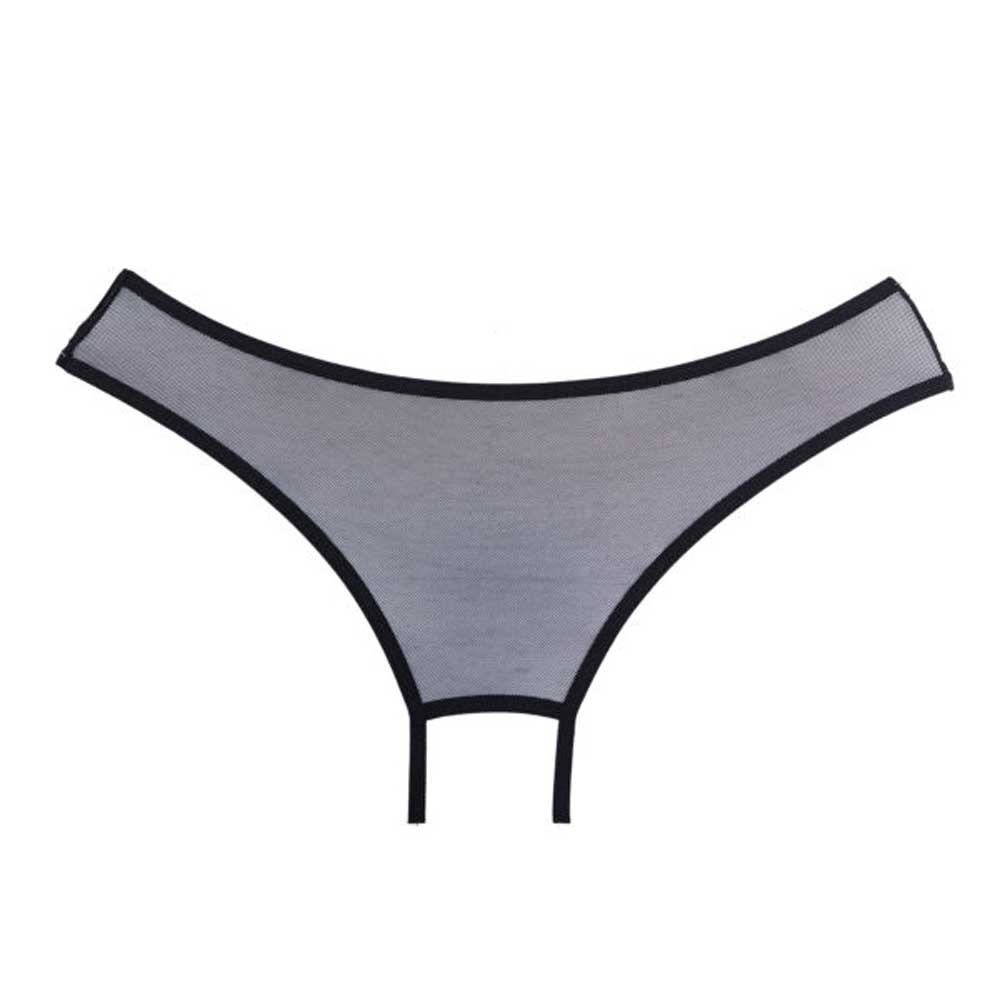 The panty with a flirtatious attitude. Fully open back panty topped with a satin bow and scalloped lace around the hips. Crotchless and mesh front. Material: 90% polyester, 10% elastane One size runs from S-L range Boxed item