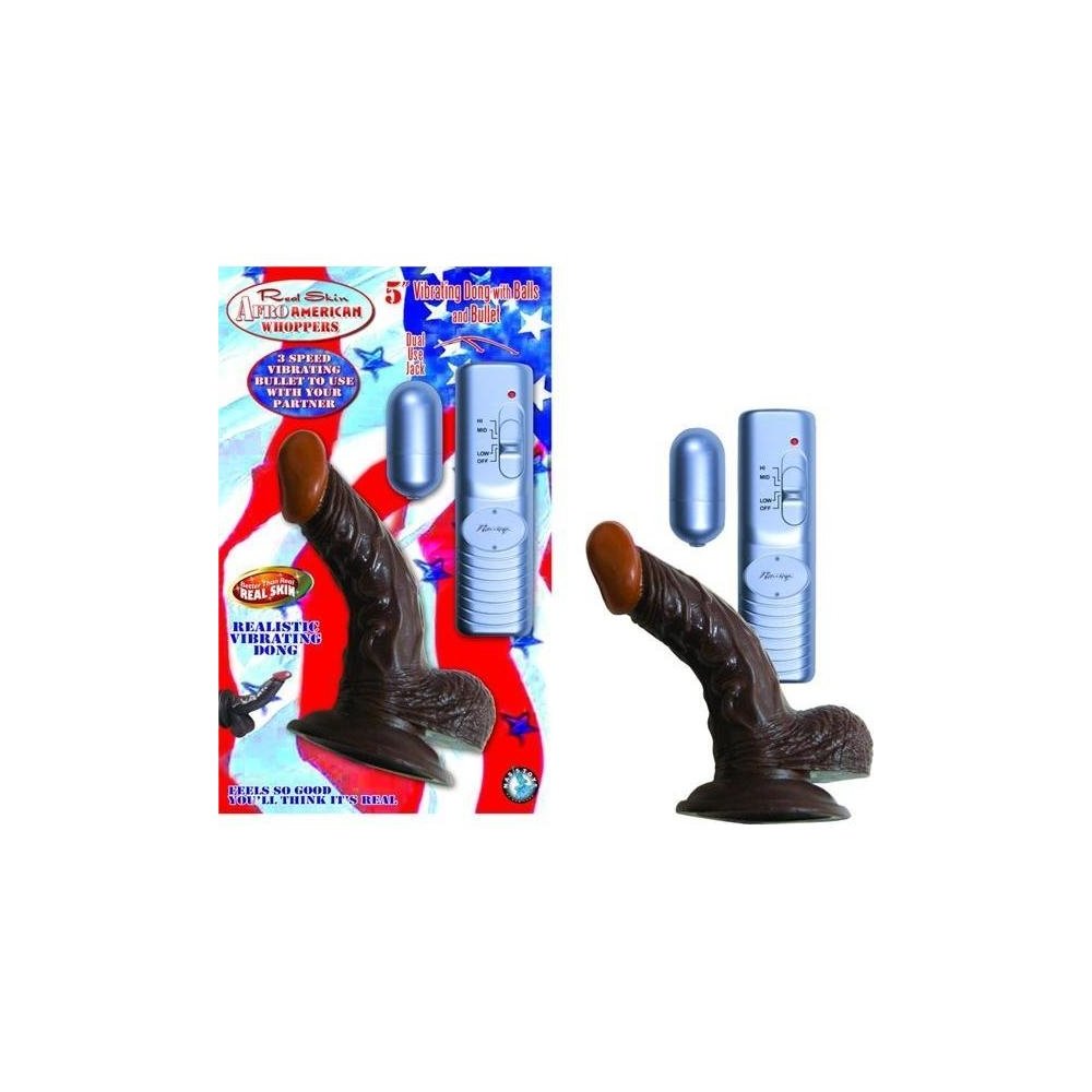 Afro American Whopper 5 inches Vibrating Brown Realistic vibrating dong from Nasstoys of New York. Realskin flexible vibrating curved dong with balls and suction cup base. 2 inches vibrating bullet included to use with dual jack. 3 speed dong and bullet.