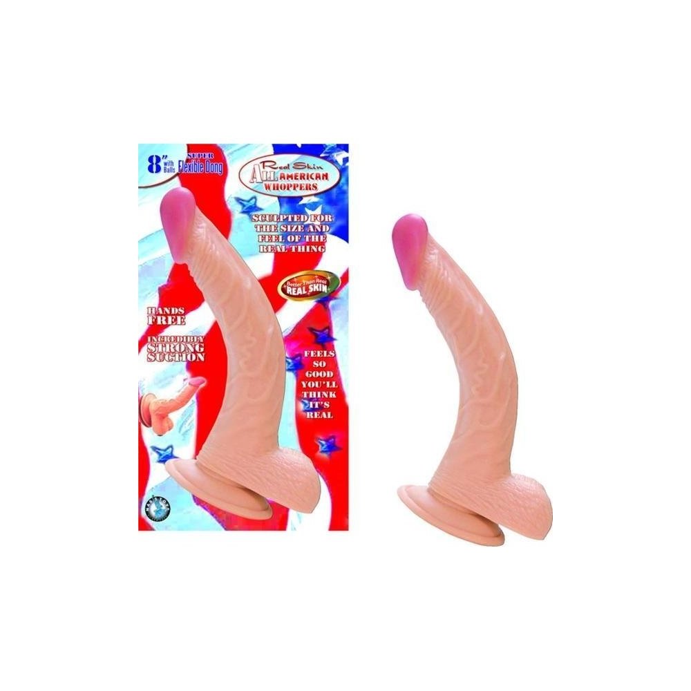 All American Whopper 8 inches with Balls Beige Realistic Realskin flexible curved dong with balls and suction cup base. Made using phthalate free, non-toxic materials Dong PVC. Recommended lubricants are water base. Harness compatible with o-ring strap o