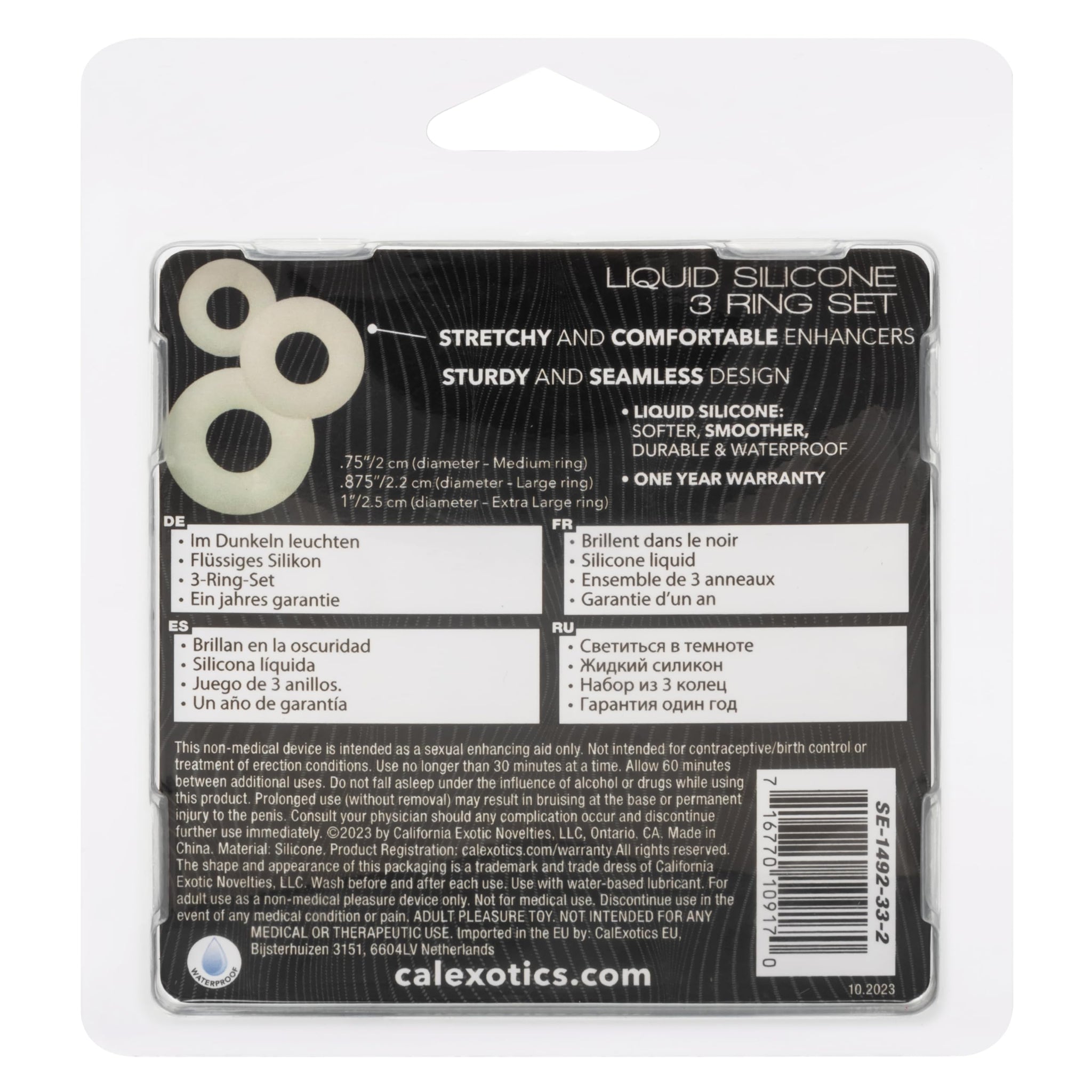 Q: What materials are used in the CalExotics Alpha Glow-in-The-Dark Penis Ring Set?A: The CalExotics Alpha Glow-in-The-Dark Penis Ring Set is made from premium Liquid Silicone, known for its softness, smoothness, and durability.