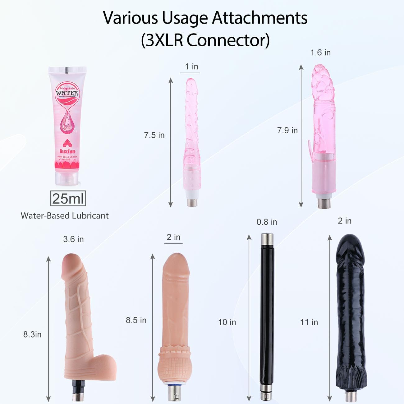• Q: What attachments are included with the AUXFUN Sex Machine? A: The product includes a sex machine, a power supply, a plug adapter, an extension tube, two pink dildos, one big black dildo, two flesh dildos, and a 25ml bottle of water-based lubricant.