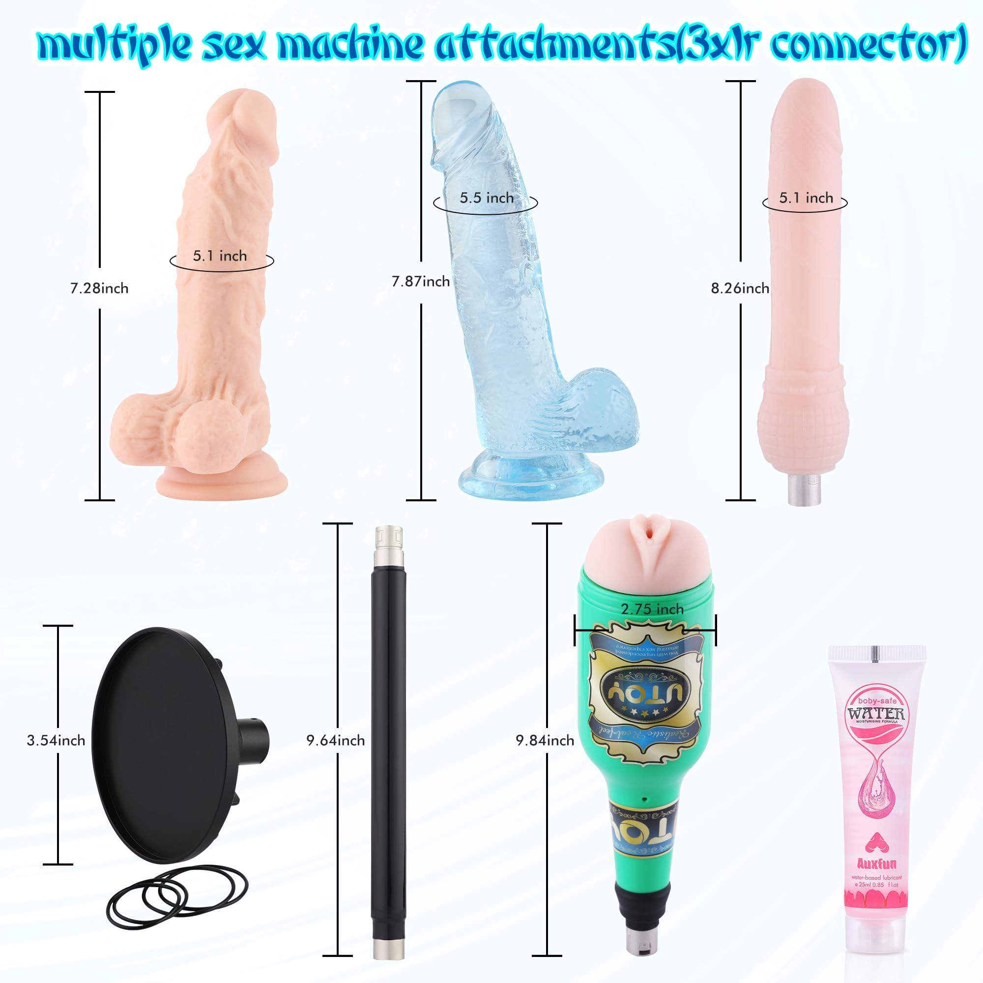 Portable sex machine with a choice of dildo attachments for versatile, thrusting pleasure wherever you go. PRODUCT PARAMETERS Color: Black Power: 0-24W Input: 100V-240V,50/60Hz Output: DC 12-24V,1-2A Speed: 0-450 times per minute Extension Distance: 2.36 inches Adjusting Angle: 0-85 degree PACKAGE INCLUDING: 1*Sex machine 1*Power Supply 1*Plug Adapter 1*Extension Tube 2*Flesh colour Dildo 1*Light Blue Dildo 1*Suction Cup 1*Masturbator 1*Lube Sample Tips for use: 1. Pay attention to hygiene, please clean all accessories before use. Wipe clean and save in time after use. 2. The suction cups can not work on the carpet and bed surface, if you want to use the suction cups, please add a little water on the smooth surface to use. 3. Please turn off the adjustment knob, unplug the power cord, clean the machine and accessories, and keep it in a cool and ventilated place after use. This amazing electric erotic machine will bring endless fun to your playtime.Simply attach the dildo or anal plug, turn on the power, and then adjust the intensity of the penetration speed with the simple knob to enjoy this toy alone or with others.You can also adjust the angle.The device is compact and lightweight.Get ready for incredible hands-free pleasure! EFFECTIVENESS: Endocrine regulation therapy by stretching and twitching to massage women 's sensitive areas, designed to improve the quality of your sex life.