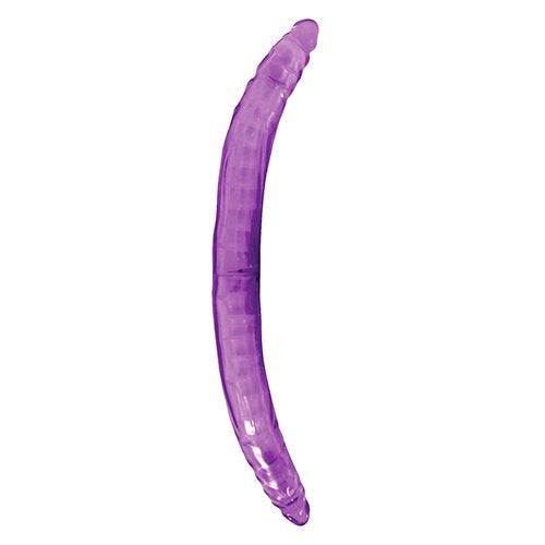 Bendable Double Dong Purple. Flexible, clear jelly 14 inches slim vibrating double dong. Please your partner while pleasing yourself! Or, if you are flying solo, use one end for vaginal penetration and one end for anal penetration. Dong is flexible to sat