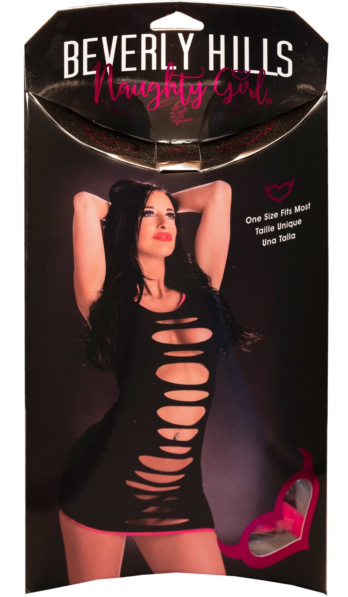 Q: What is the design style of this dress?A: The dress features cut-outs and piping, providing a naughty yet stylish look, perfect for those looking to add a playful touch to their wardrobe.