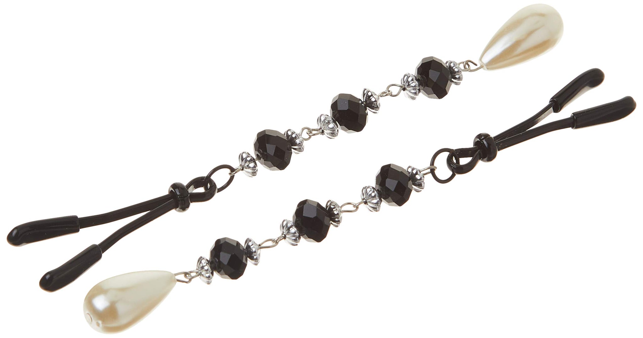 Q: What materials are used in the Bijoux De Nip Nipple Clamp?A: The Bijoux De Nip Nipple Clamp features a design decorated with multi-faceted black beads and silver findings. The drop is made of faux pearl.