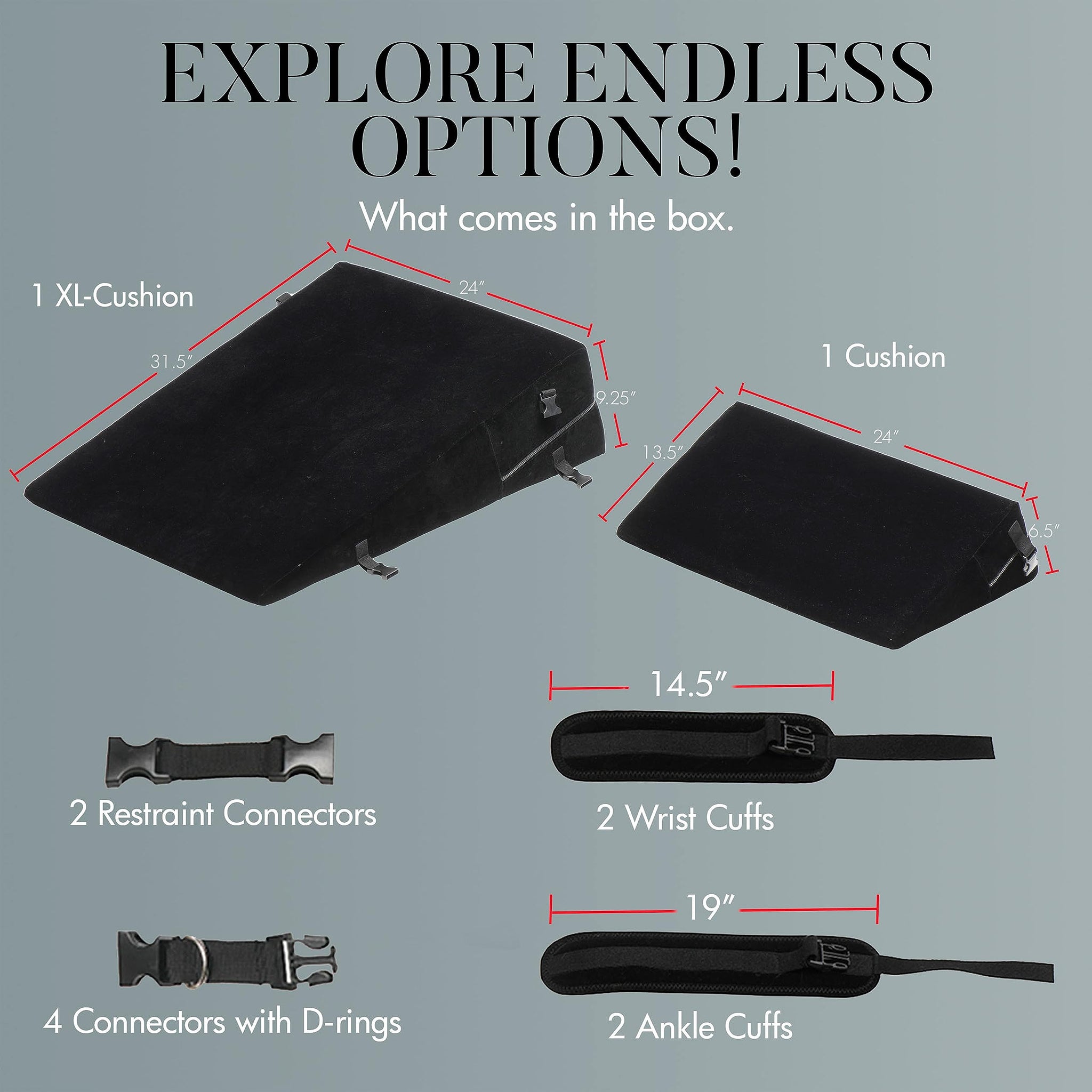 Reinvent sex with this bondage wedge pillow set! Positions you couldnt reach before are now accessible with these supportive, comfortable and velvety soft wedges made out of high-density foam. Reach new heights of enhanced pleasure and enjoy finding the perfect position and keeping your partner there with the built-in clips that matching wrist and ankle cuffs attach to! The velvety soft outer cover and the water-resistant inner cover are also machine washable so you can play hard, get wet, rinse and repeat!