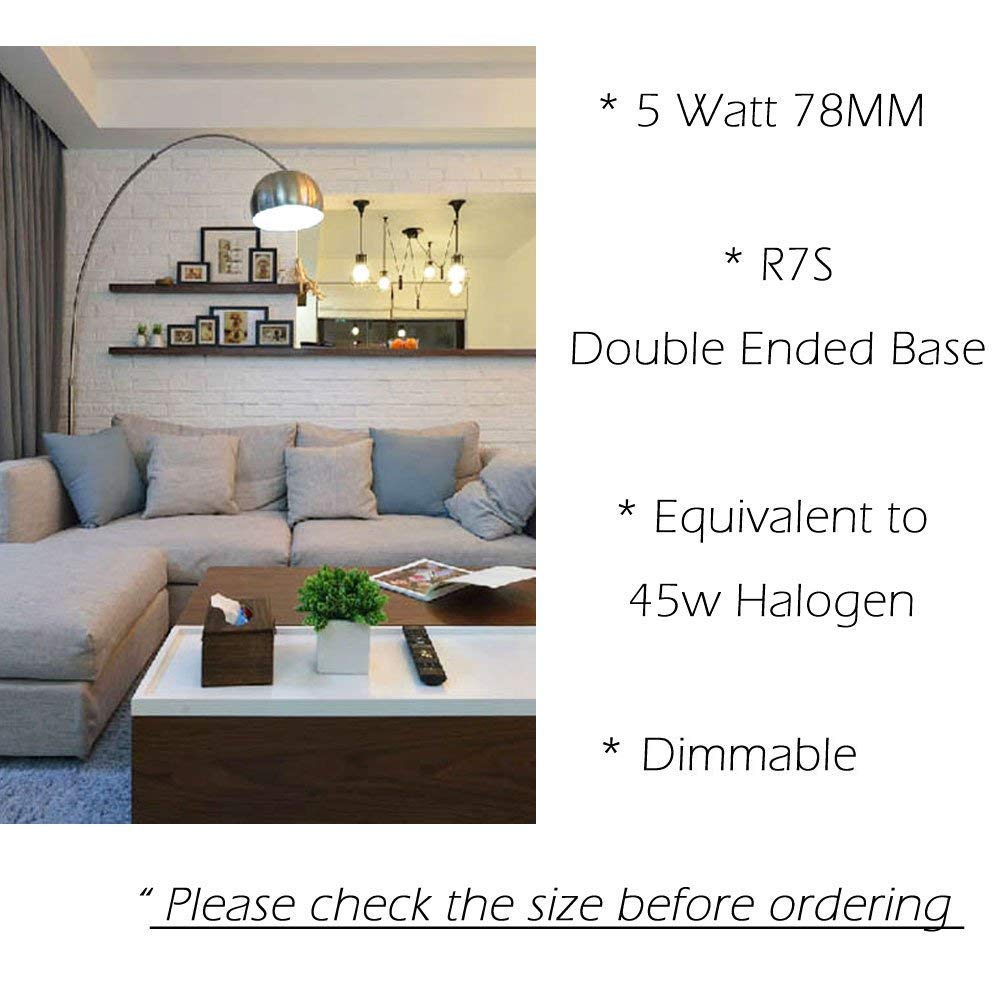 Bonlux 5W Dimmable J78 R7S Double Ended LED Bulb Specification: Dimension: F15*78mm (0.59*3inch) Power: 5 Watts Input Voltage: AC 100-130V Lumen: 500lm Light Color: Daylight 6000K Beam angle: 360 degree Lamp Base: R7S Dimmable: Yes CRI:?80Ra NOTE: NOT suitable for use in totally enclosed fixture 0.59'' diameter, 3'' length, may a little bit bigger than halogen T3 bulb, make sure the size fit your fixtures before purchase. No Ballast Required, make sure to remove or bypass the ballast from your existing fixture before installation. Using the ballast will cause them to flicker or destroy the LED Bulb. Package: 5W Dimmable 78mm LED R7S Flood Light Bulb x 2 Application: Replacement for Traditional halogen double-ended tubes. Mainly used in indoor household lighting, night lighting, advertising, plaque lighting, landscape lighting, hotel lighting, Showroom lighting, workshop lighting, parking lot lighting, garage lighting, clothing store lighting and other occasions, widely used.
