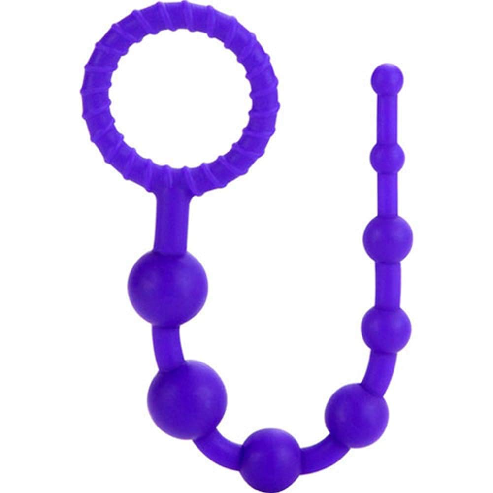 Booty Call X-10 Beads Purple. Graduated, durable, firm and flexible Silicone pleasure beads. Sturdy retrieval ring. Safe and pure for body and pleasure. Made using phthalate free, non-toxic materials Silicone. Anal beads measure 8 inches long by 0.75 inch