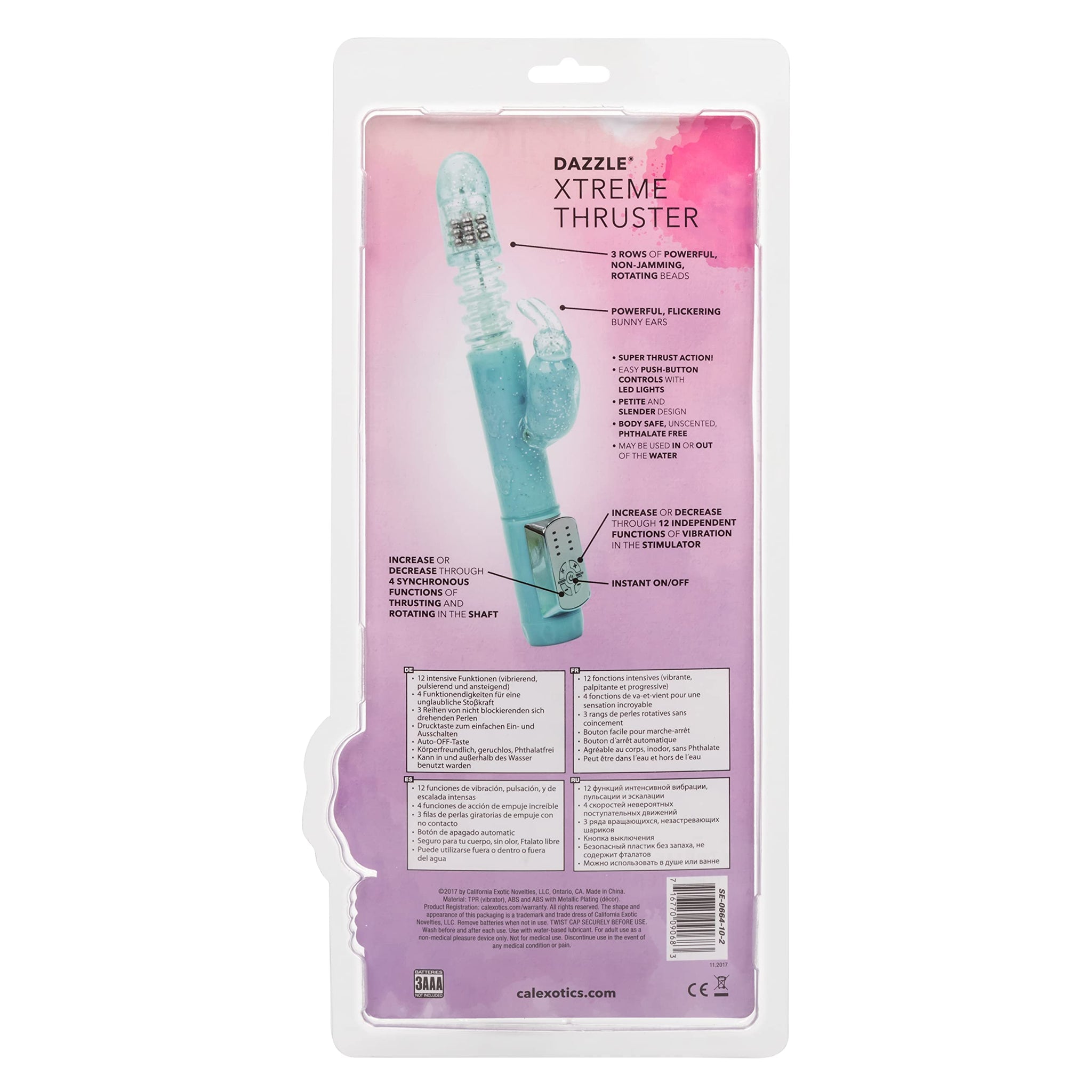 CalExotics brings thrilling fantasies to life with the sparkling Dazzle Xtreme Thruster. The powerful thrusting massager has 12 playful vibration functions, 4 mind-blowing thrusting functions and 4 rotating shaft functions for a pleasure experience of a lifetime. To maximize and customize your pleasure, the easy-touch button control pad lets you independently operate the plethora of vibration, rotation and up-and-down thrusting options.While the teasing bunny stimulator flickers, the smooth helmet-shaped tip thrills internal pleasure points with 4 functions of thrusting action. The precision thrusting tip has a powerful up-and-down action to ensure you always hit just the right spot. The fluttering ears and nose of this ravishing rabbit houses a powerful vibration motor delivering blissful external stimulation.Shaft Size: 5.25??x 1.25??(13.25 cm x 3.25 cm)Rabbit Size: 2.75??x 1.25??(7 cm x 3.25 cm)Materials: Body safe, phthalate free Thermoplastic Rubber (TPR) with ABS plastic base. Power up your pleasure with 3 AAA batteries.Why Choose CalExotics?Since 1994, CalExotics has been the world?? leading pleasure products manufacturer and is dedicated to being a consumer-friendly brand for men and women. We understand that to truly encourage sexual wellness, the intimate toy industry needs to create products that enhance pleasure in your everyday life and cultivate a happier and more satisfied you.CalExotics has taken the very limited intimate toy options from the past and created a world of pleasure products for men, women and couples. By revolutionizing the way we see intimate products, CalExotics has been able to help everyone find confidence in their sexuality and promote sexual self-awareness. At CalExotics, we want you to expect more. Expect more passion, expect more romance and always expect more fun.