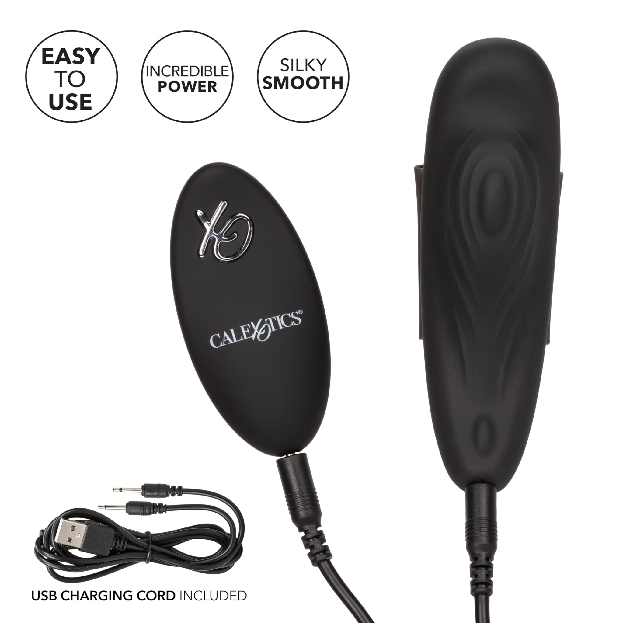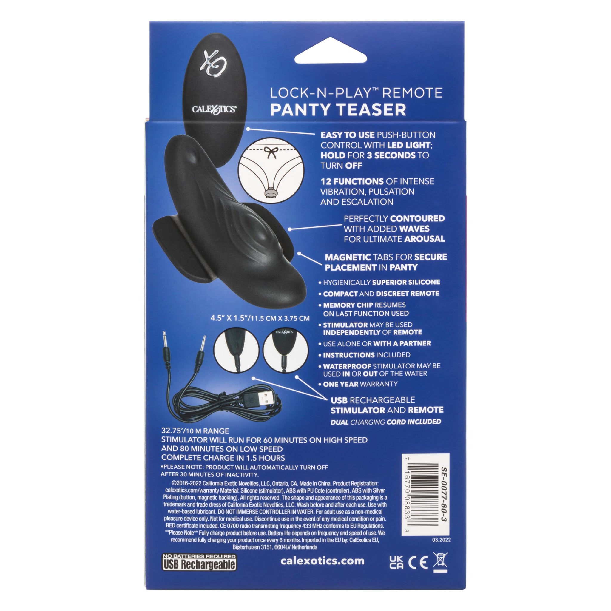 Q: What is the CalExotics Lock-N-Play Remote Panty Teaser?A: The CalExotics Lock-N-Play Remote Panty Teaser is a rechargeable, waterproof silicone clitoral vibrator designed to be securely attached to your panty. It features 12 functions of vibration, pulsation, and escalation for enhanced pleasure.