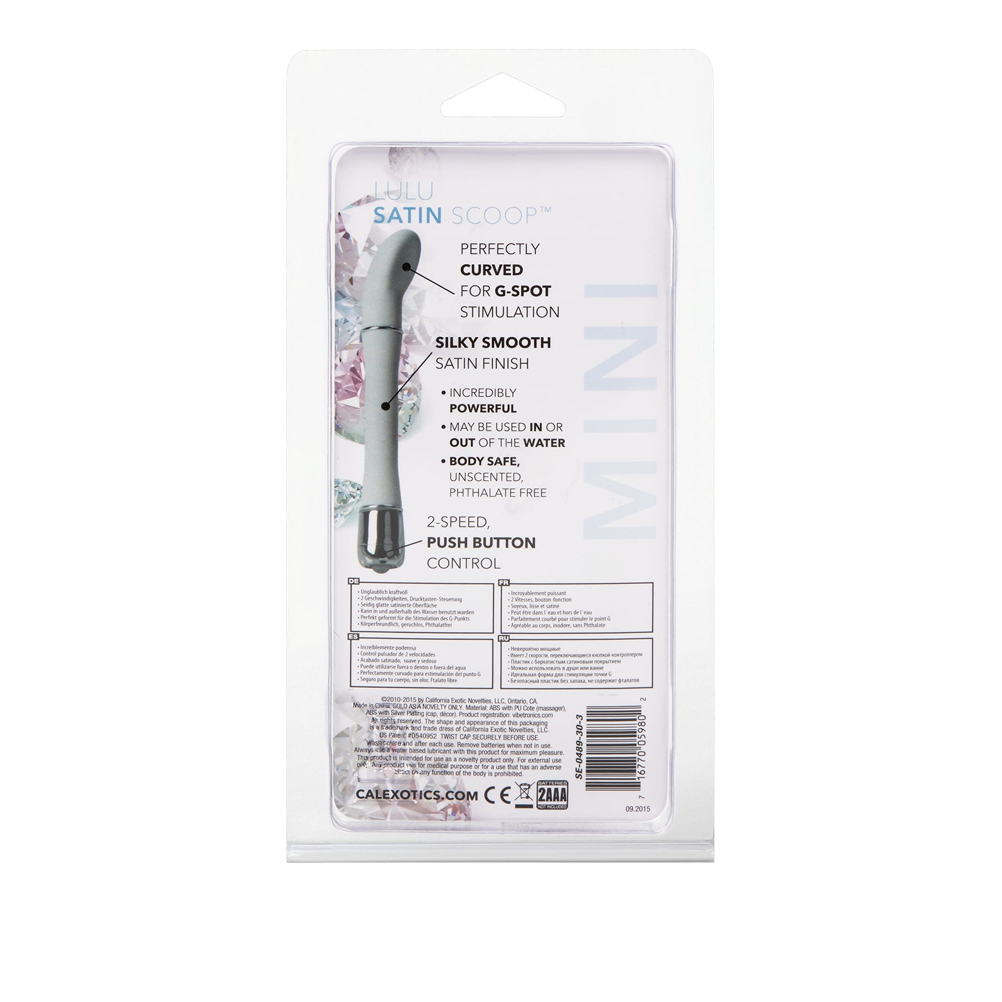 Q: What are the key features of the California Exotic Novelties Lulu Satin Scoop?A: Key features include a satiny-soft texture, 2-speed push-button operation, G-spot stimulation, waterproof design, and a slender size.