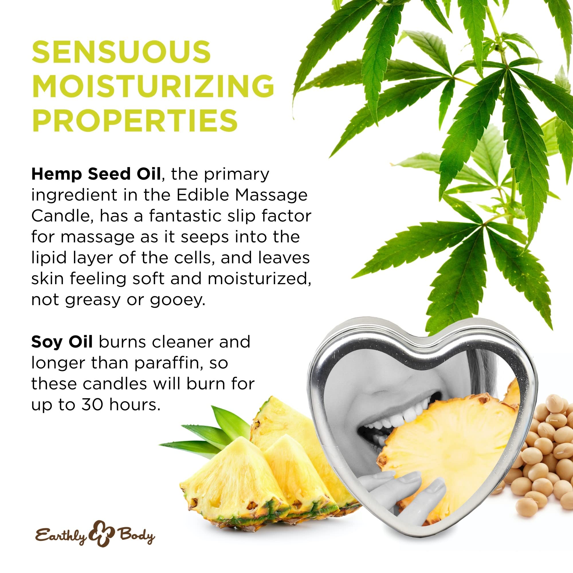 Q: What scents are available for the Earthly Body Edible Massage Candle?A: This specific product features a delightful pineapple scent, creating a tropical atmosphere during use.