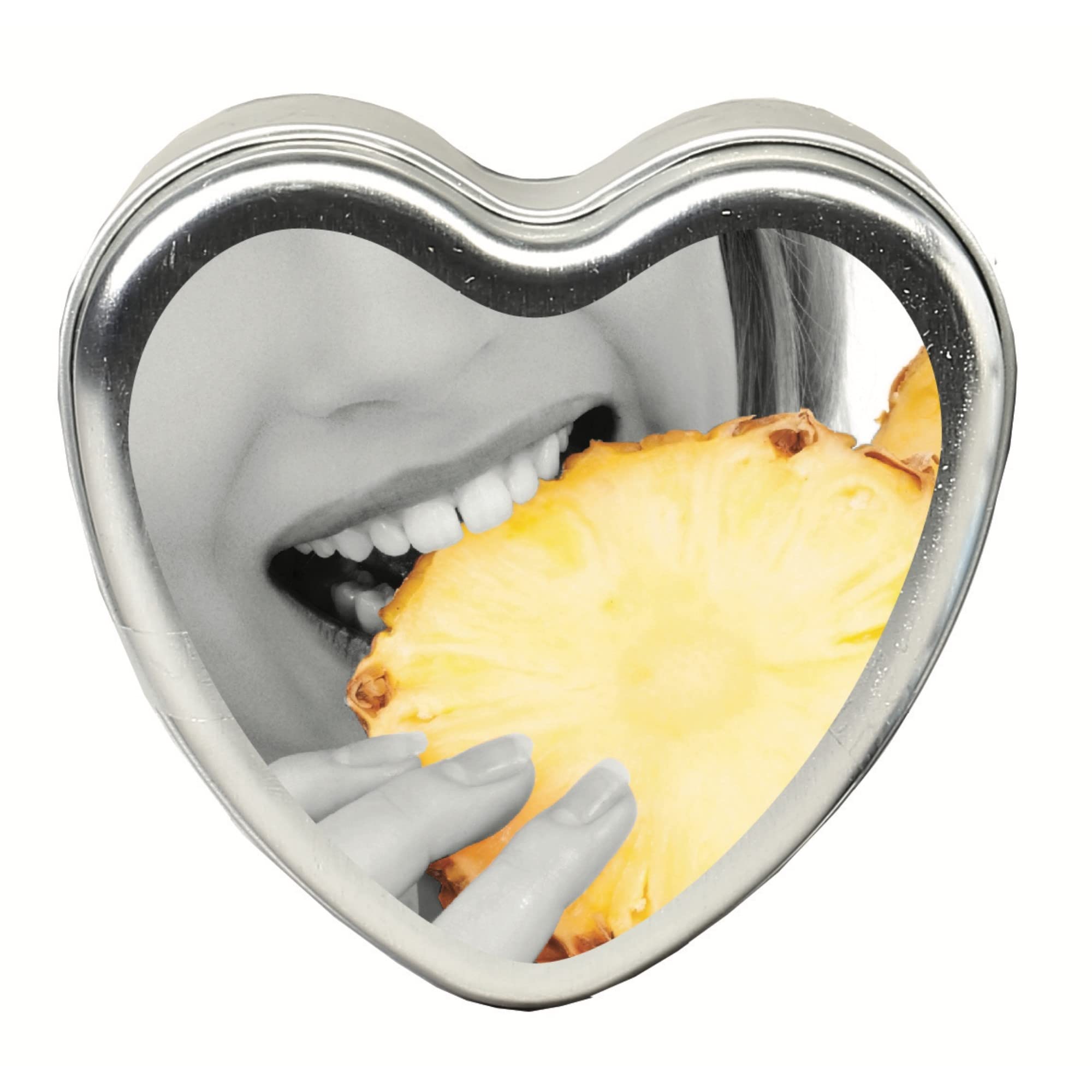 Earthly Body Tropical Collection Candle 3 In 1 Edible Pineapple Breeze heart shaped tin. New tropical massage candle with island floras and flavors. Appear healthy and hydrated with a youthful looking glow. Experience this liquid gold by pouring it direct