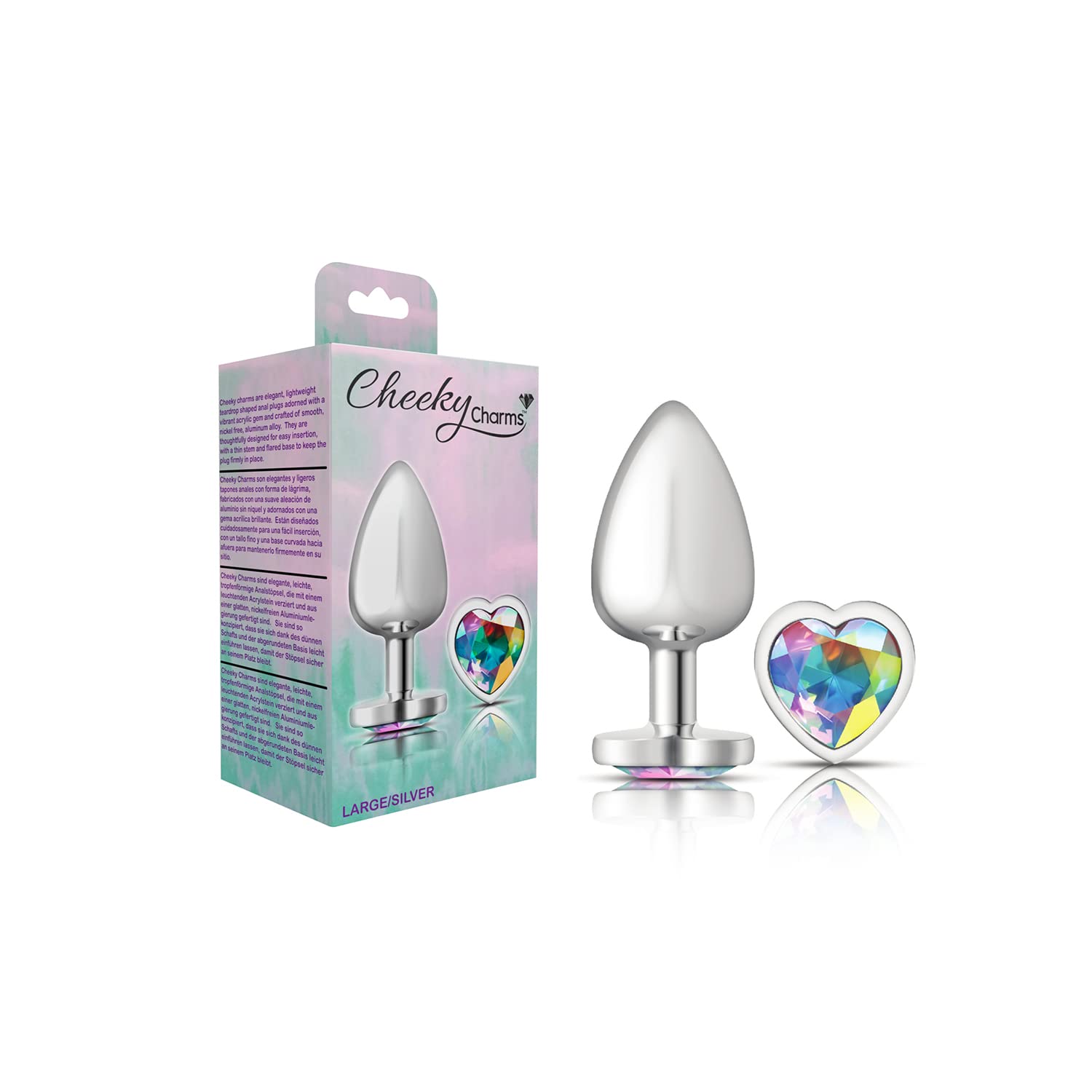 Cheeky Charms Heart Clear Iridescent Large Silver Butt Plug from Viben. Cheeky Charms is a collection of vibrant, seductive metal anal plugs, each showcasing a beautiful Acrylic gemstone. These butt plugs are great for temperature play and anyone who want