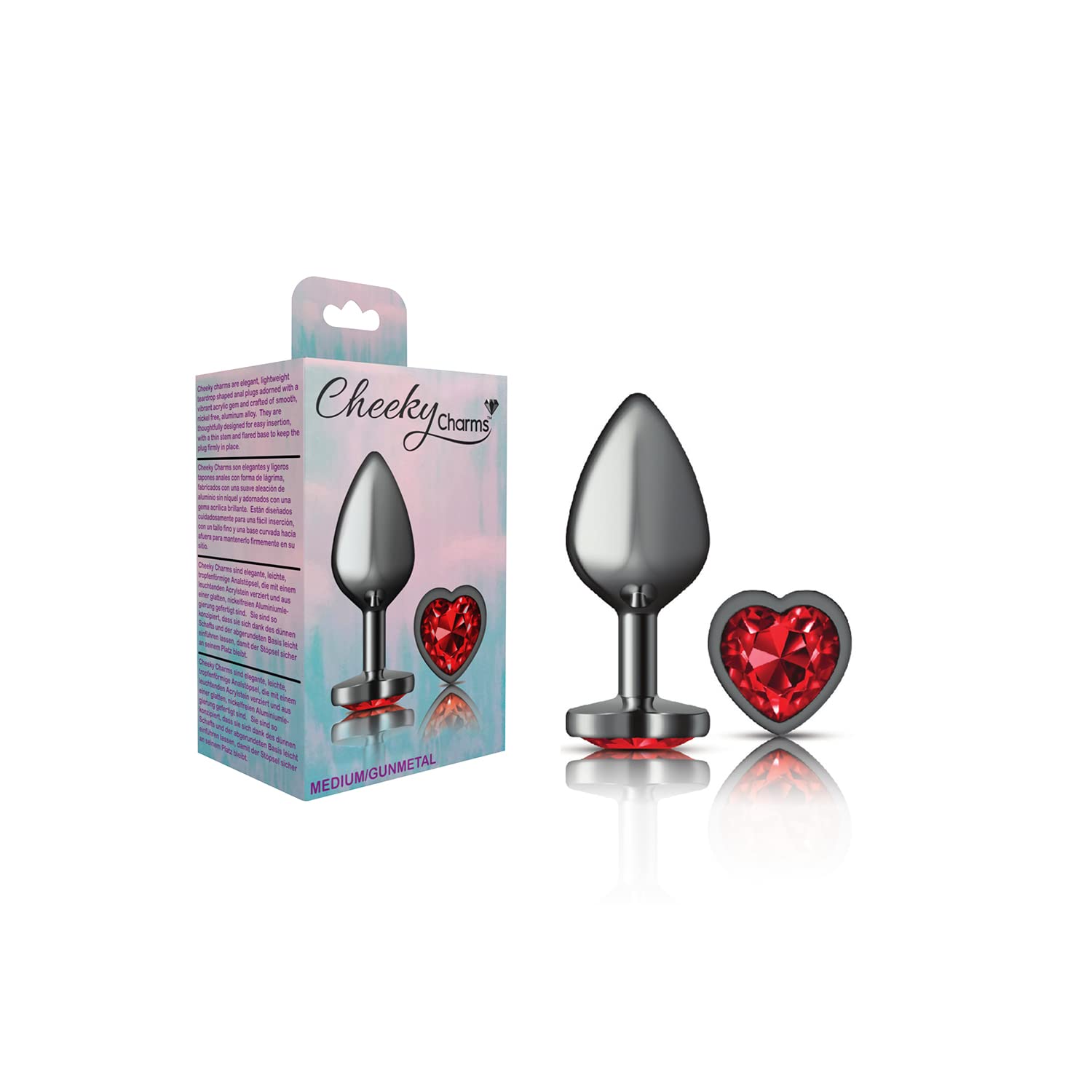 Cheeky Charms Heart Deep Red Medium Gunmetal Butt Plug from Viben, is a collection of vibrant, seductive metal anal plugs, each show casing a beautiful Acrylic gem stone. These butt plugs are great for temperature play and anyone who wants to decorate the
