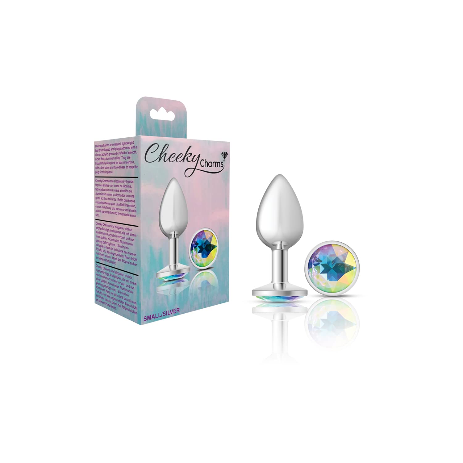 Cheeky Charms Round Clear Iridescent Silver Small Butt Plug from Viben. Cheeky Charms is a collection of vibrant, seductive metal anal plugs, each show casing a beautiful Acrylic Gem Stone. These butt plugs are great for temperature play and anyone who wa