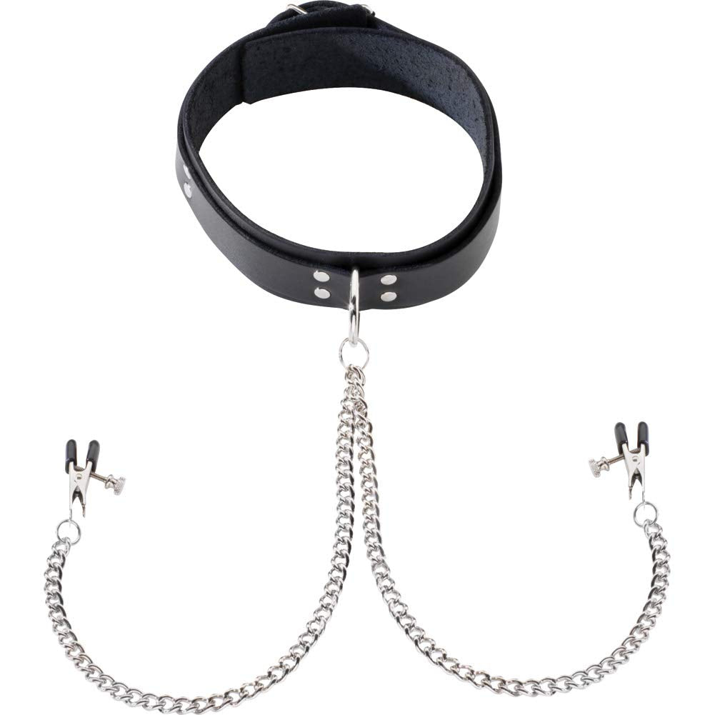Q: What is the Blk Leather Collar W/broad Tip Clamps made of?A: The collar is made of sturdy yet comfortable leather, combined with nipple clamps that feature broad tip ends dipped in black rubber for added comfort.