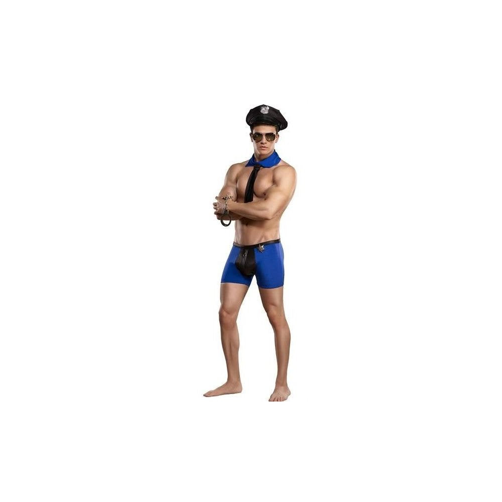 Male Power Officer Frisk-em Costume Large Extra Large. 3 piece set includes: shorts, tie/collar, badge. Hat sold separately. Man up in these colorful costume collection, designed especially for him. Bedroom Costumes: Every fantasy is fulfilled by this mis