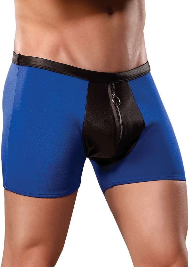 Q: What does the Male Power Officer Frisk-Em costume include?A: The costume includes a short featuring a contrast pouch with a functional zipper, an O ring slider, a cire waistband, a clip-on badge, and a collar with an attached tie. The hat is sold separately.
